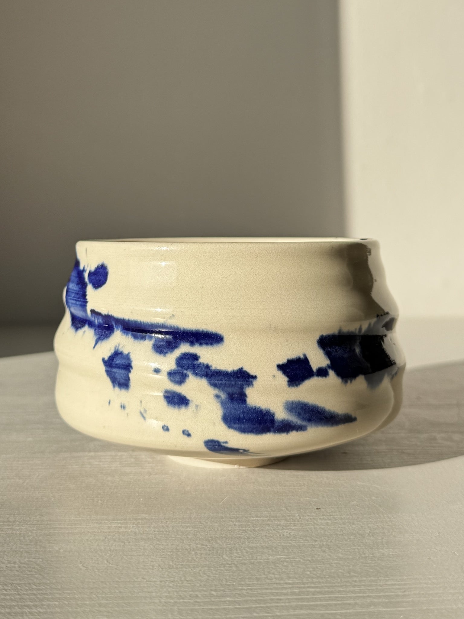 Deze kom combineert expressiviteit met rust. De diepe blauwe splash trekt meteen de aandacht, maar de zachte bolle vorm nodigt uit tot vertraging. Ideaal voor een ochtendritueel met matcha, een moment voor jezelf, of om cadeau te geven aan iemand die houdt van handgemaakt keramiek.