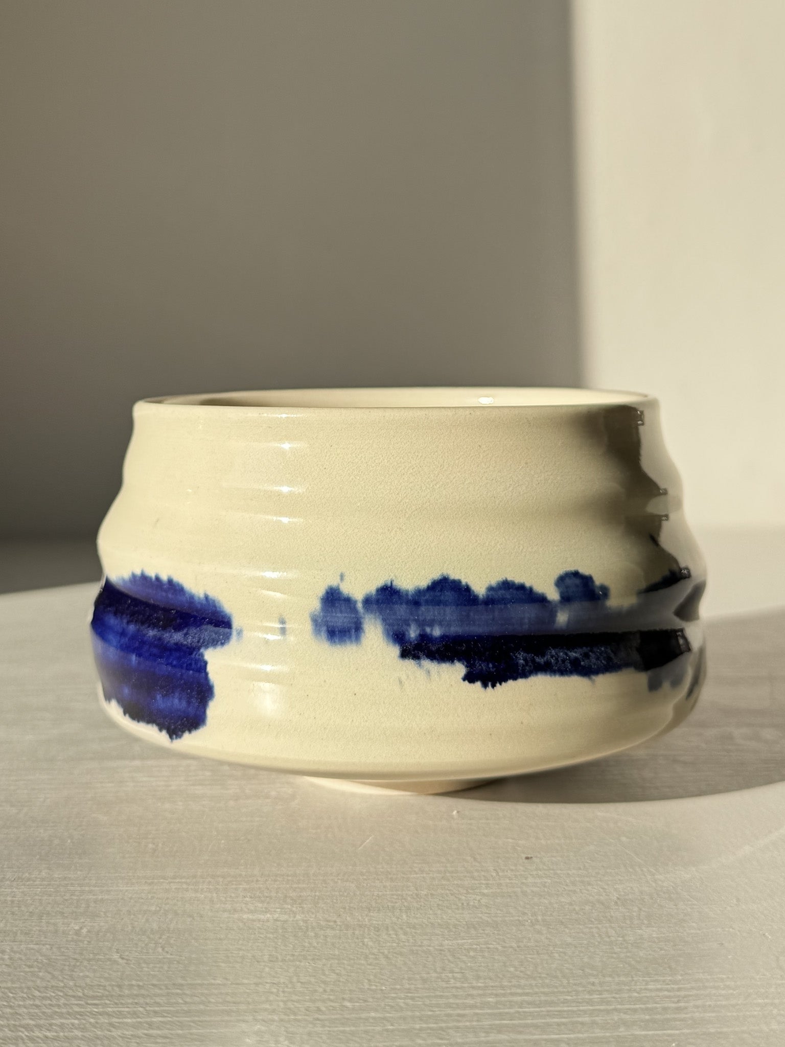Deze kom combineert expressiviteit met rust. De diepe blauwe splash trekt meteen de aandacht, maar de zachte bolle vorm nodigt uit tot vertraging. Ideaal voor een ochtendritueel met matcha, een moment voor jezelf, of om cadeau te geven aan iemand die houdt van handgemaakt keramiek.