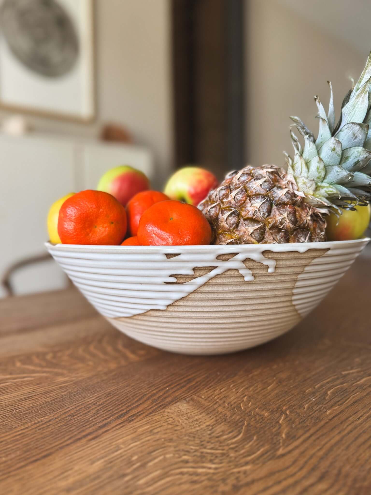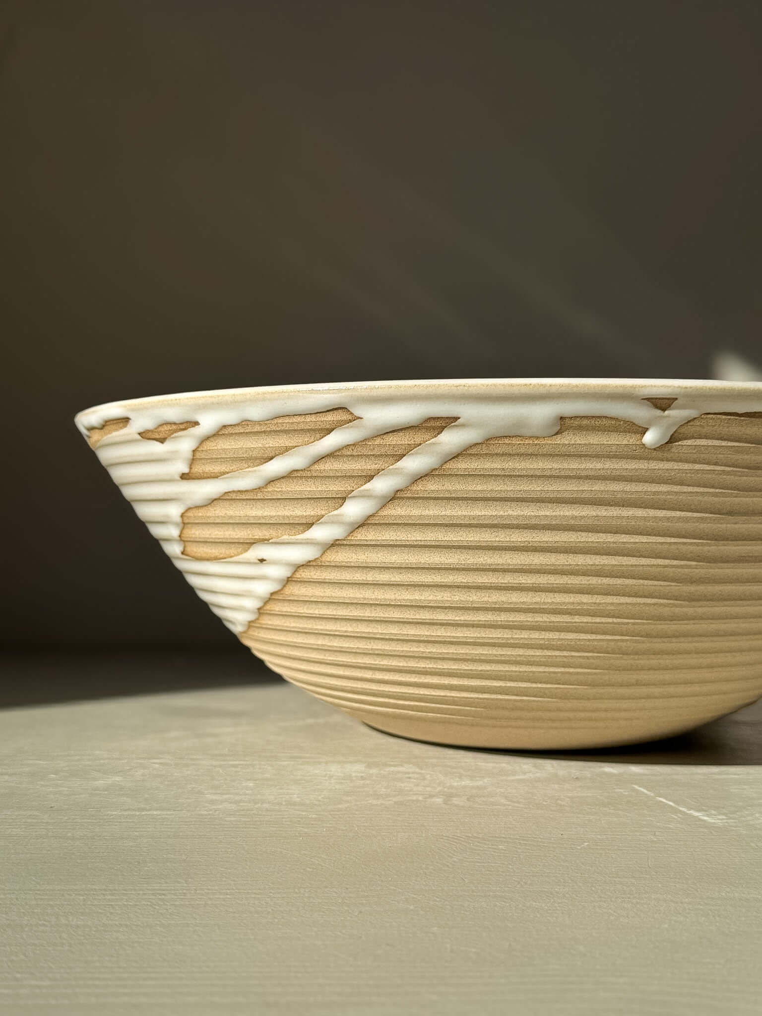 Het witte glazuur vloeit vrij over de rand en zakt deels in de gesneden structuur, waardoor er een mooi contrast ontstaat tussen glad en getextureerd. Elke lijn is bewust aangebracht, maar het uiteindelijke patroon is altijd uniek.