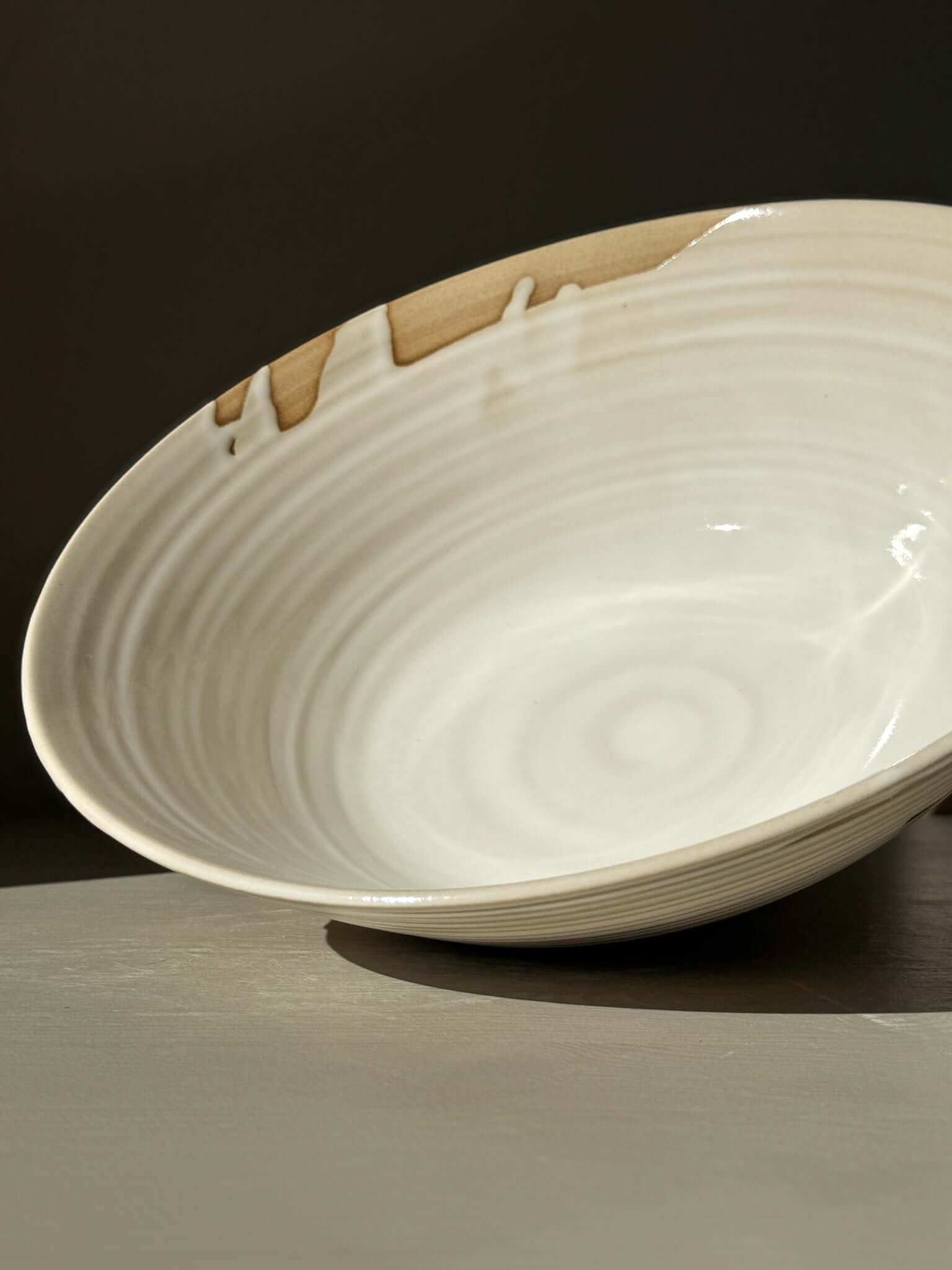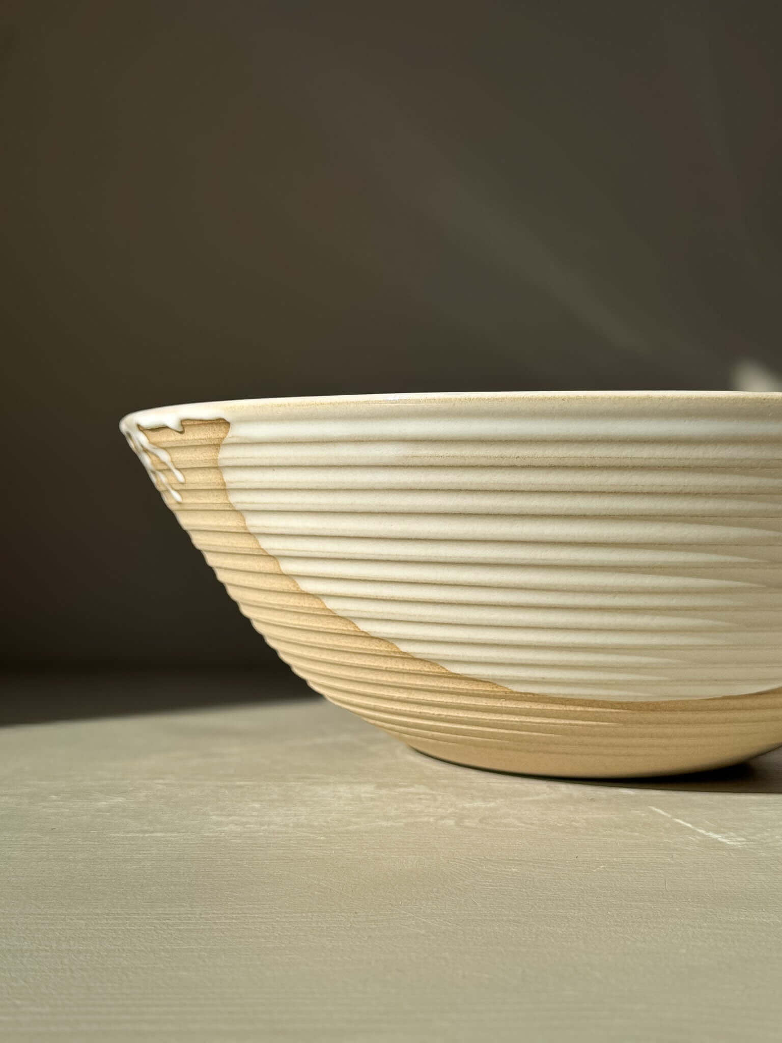 Een royale schaal met karakter, gemaakt om te gebruiken én om van te genieten. Deze grote schaal is gedraaid op de draaischijf en rondom met de hand gesneden. De zachte horizontale lijnen vangen het licht en benadrukken de warme tint van de klei.
