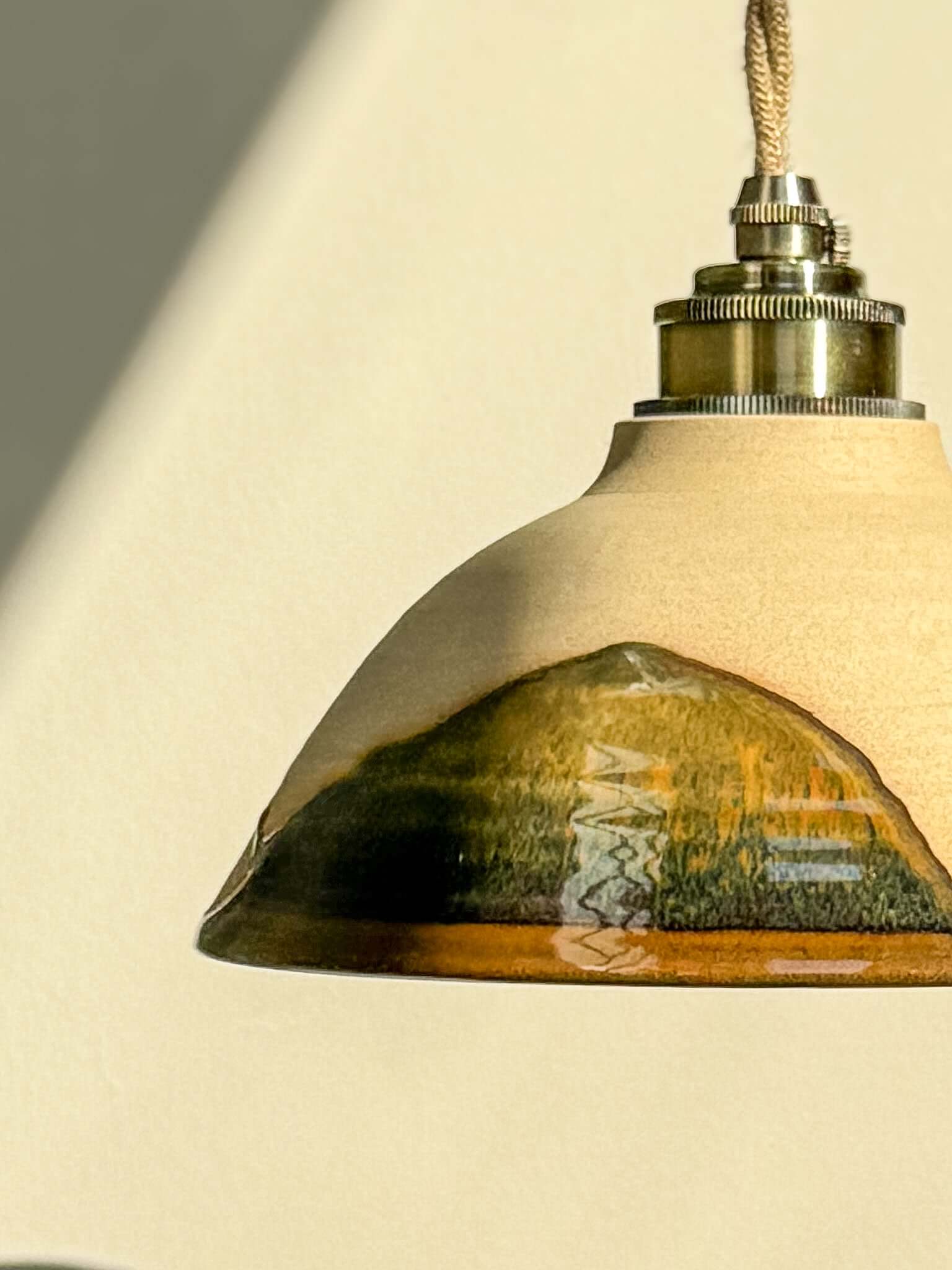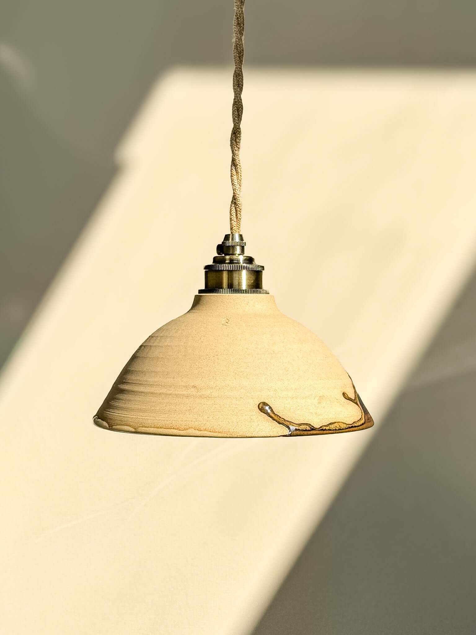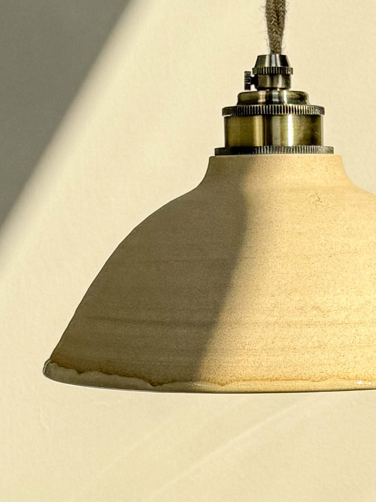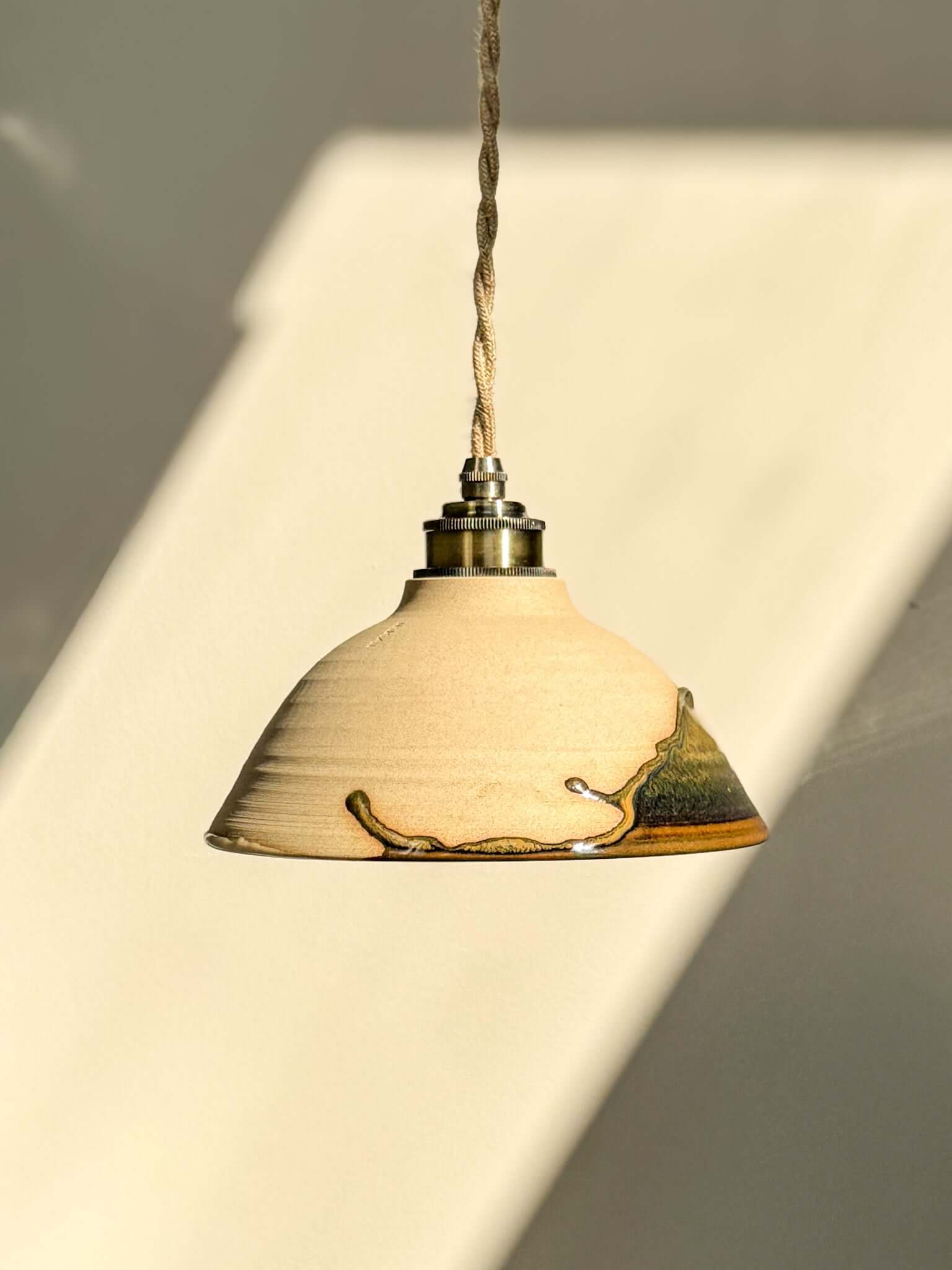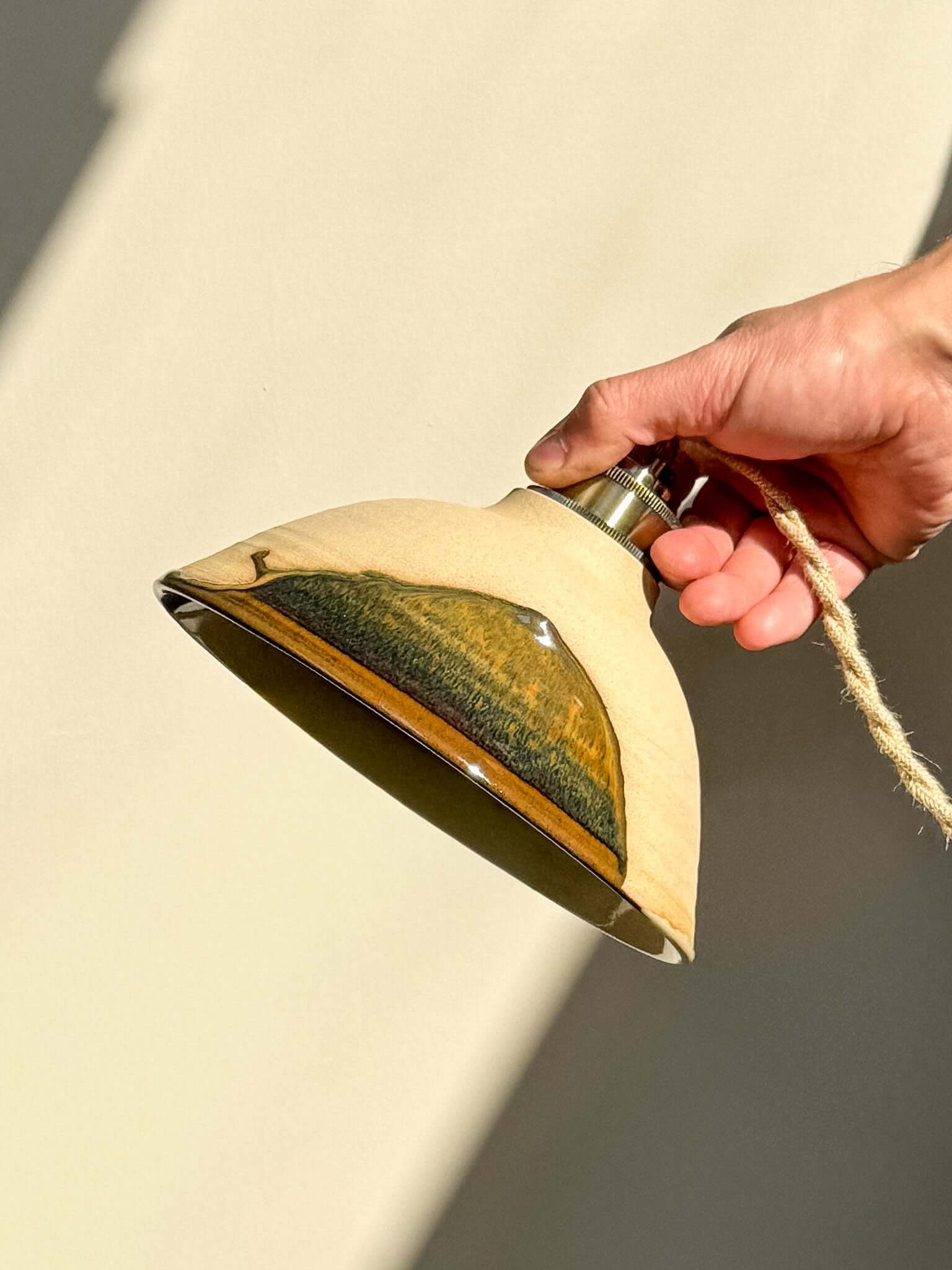 Elke lamp is met de hand vervaardigd op de draaischijf en het glazuur vloeit elke keer anders. Dat beetje onvoorspelbaarheid geeft elke lampenkap zijn eigen ritme en ziel – geen twee lampenkappen zijn ooit hetzelfde.