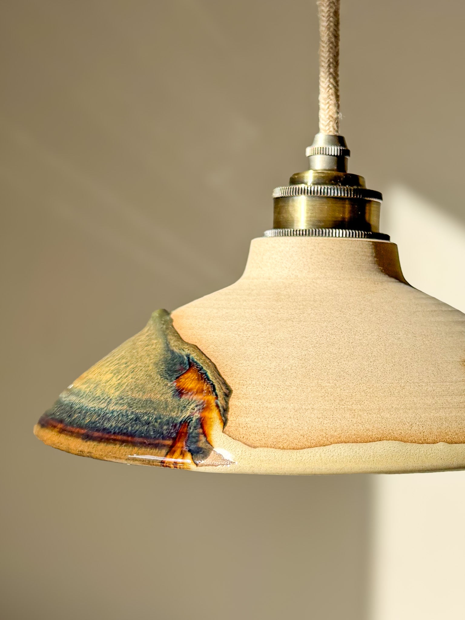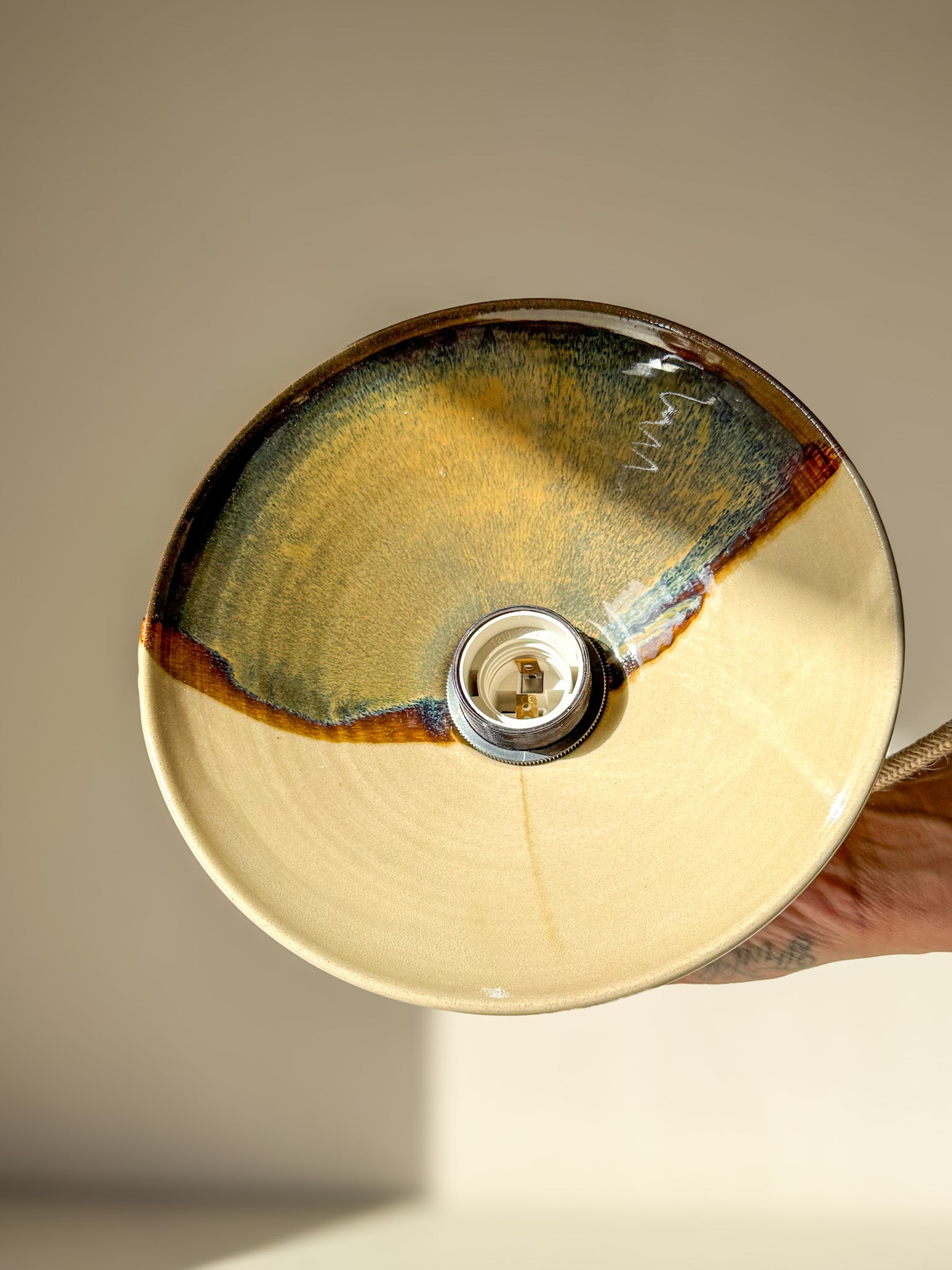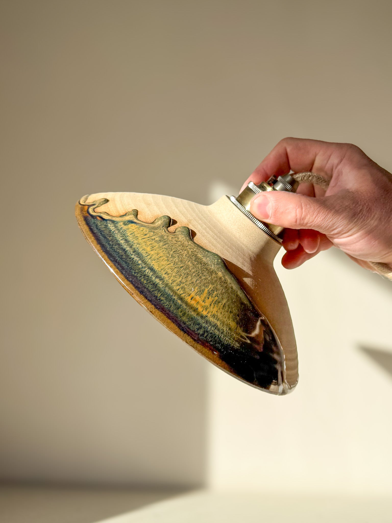 Elke lamp is met de hand vervaardigd op de draaischijf en het glazuur vloeit elke keer anders. Dat beetje onvoorspelbaarheid geeft elke lampenkap zijn eigen ritme en ziel – geen twee lampenkappen zijn ooit hetzelfde.