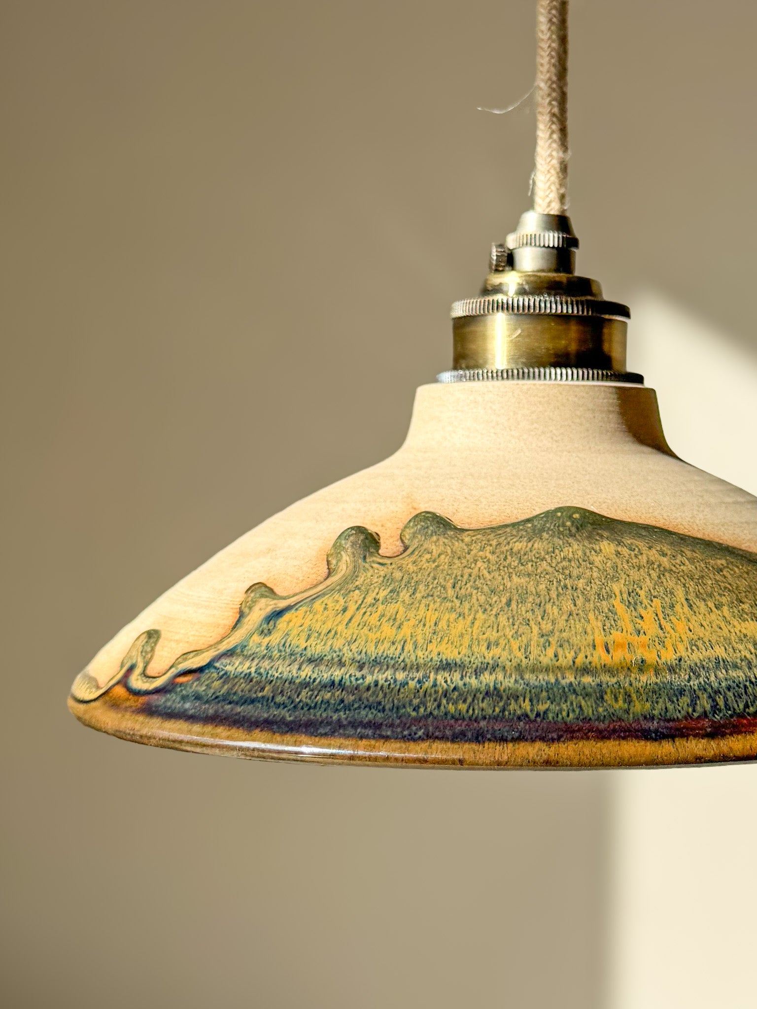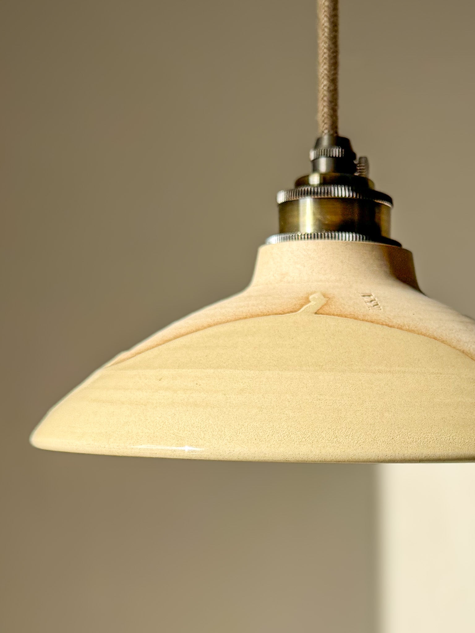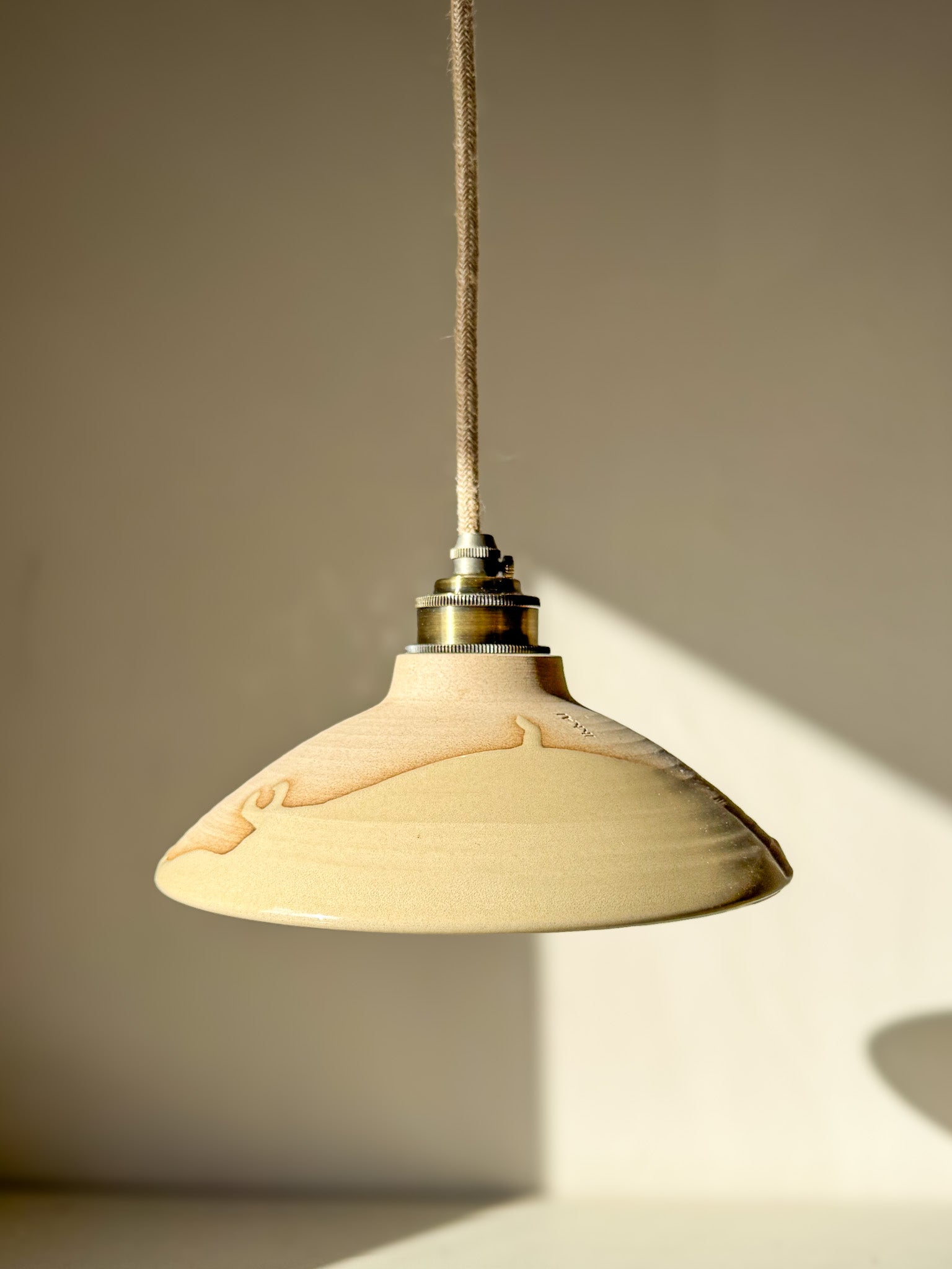 Elke lamp is met de hand vervaardigd op de draaischijf en het glazuur vloeit elke keer anders. Dat beetje onvoorspelbaarheid geeft elke lampenkap zijn eigen ritme en ziel – geen twee lampenkappen zijn ooit hetzelfde.