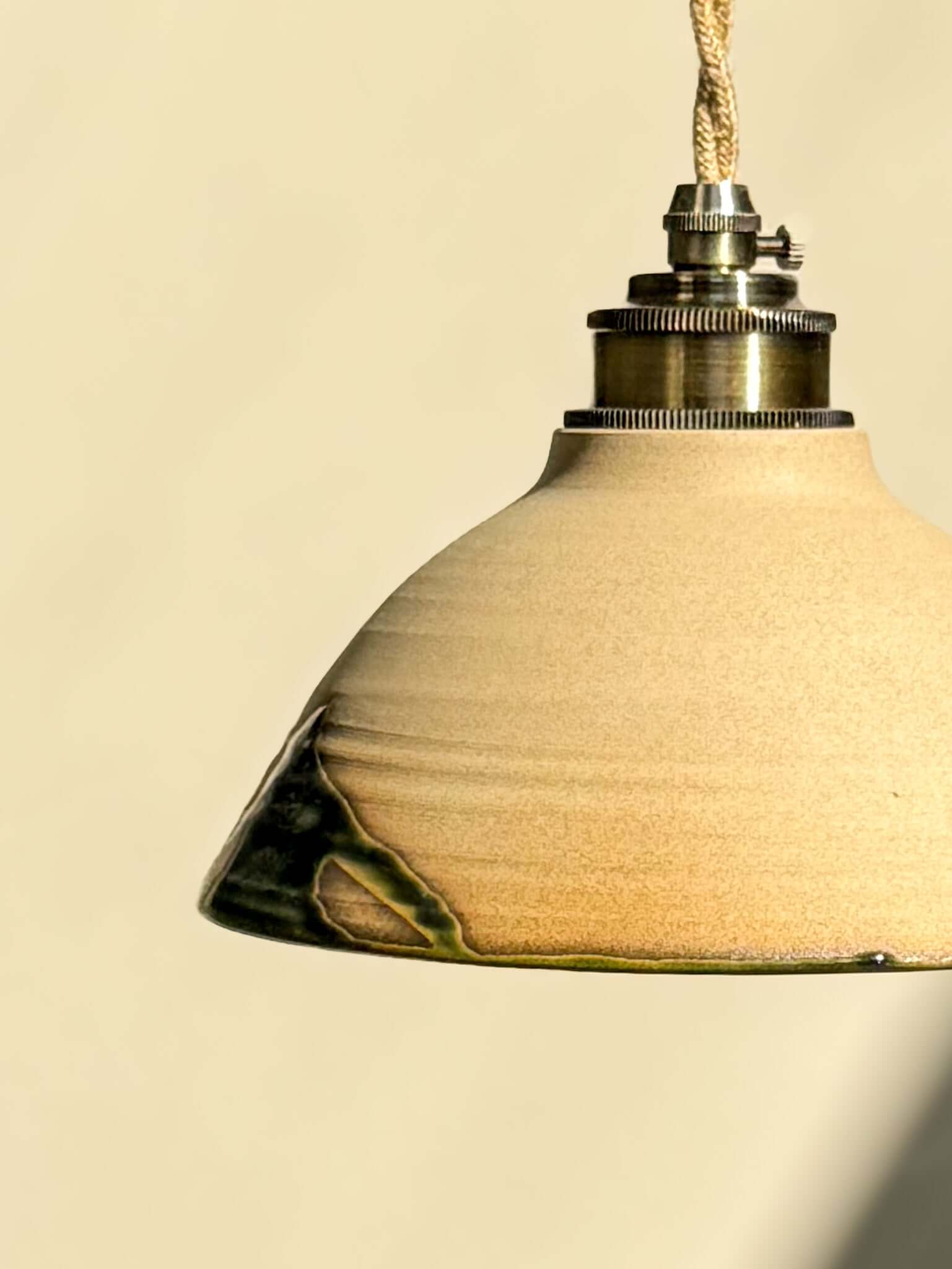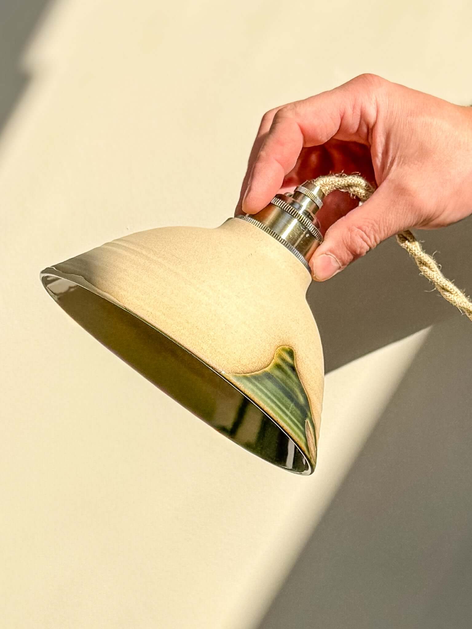 Deze nieuwe lampenkap uit de Mori-serie combineert zachte, natuurlijke tinten met de rijke diepte van bosgroen. Het glanzende glazuur stroomt naar binnen als gefilterd licht door bladeren, terwijl de buitenkant ruw en tastbaar blijft en de stille schoonheid van de klei zelf laat zien.