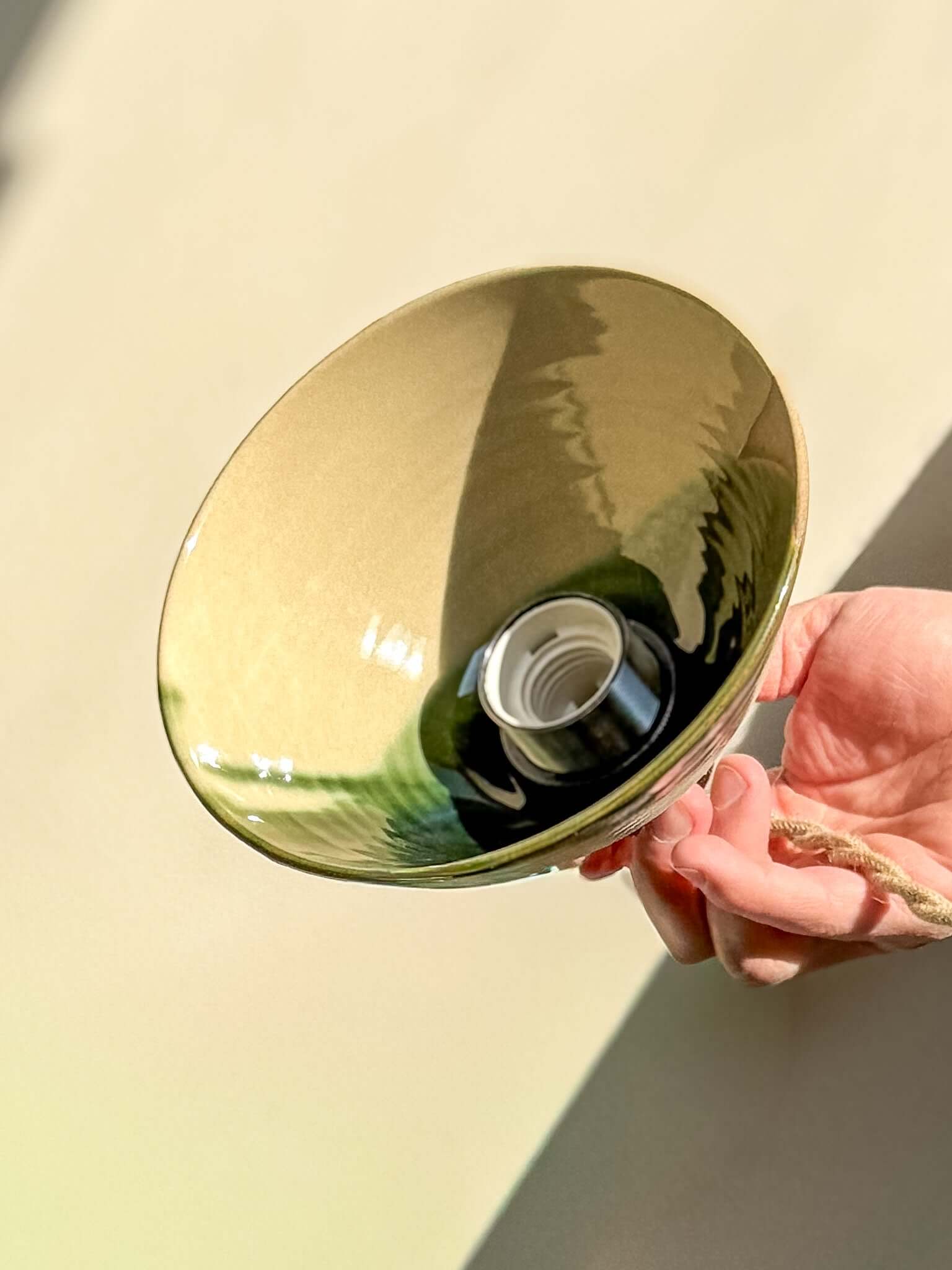 De Mori lampenkap geeft een zachte, natuurlijke gloed – warm en een tikje sfeervol, perfect voor een rustig hoekje of naast het bed. De glazuur aan de binnenkant reflecteert het licht prachtig en vervaagt van mosgroen naar diepe bostinten.