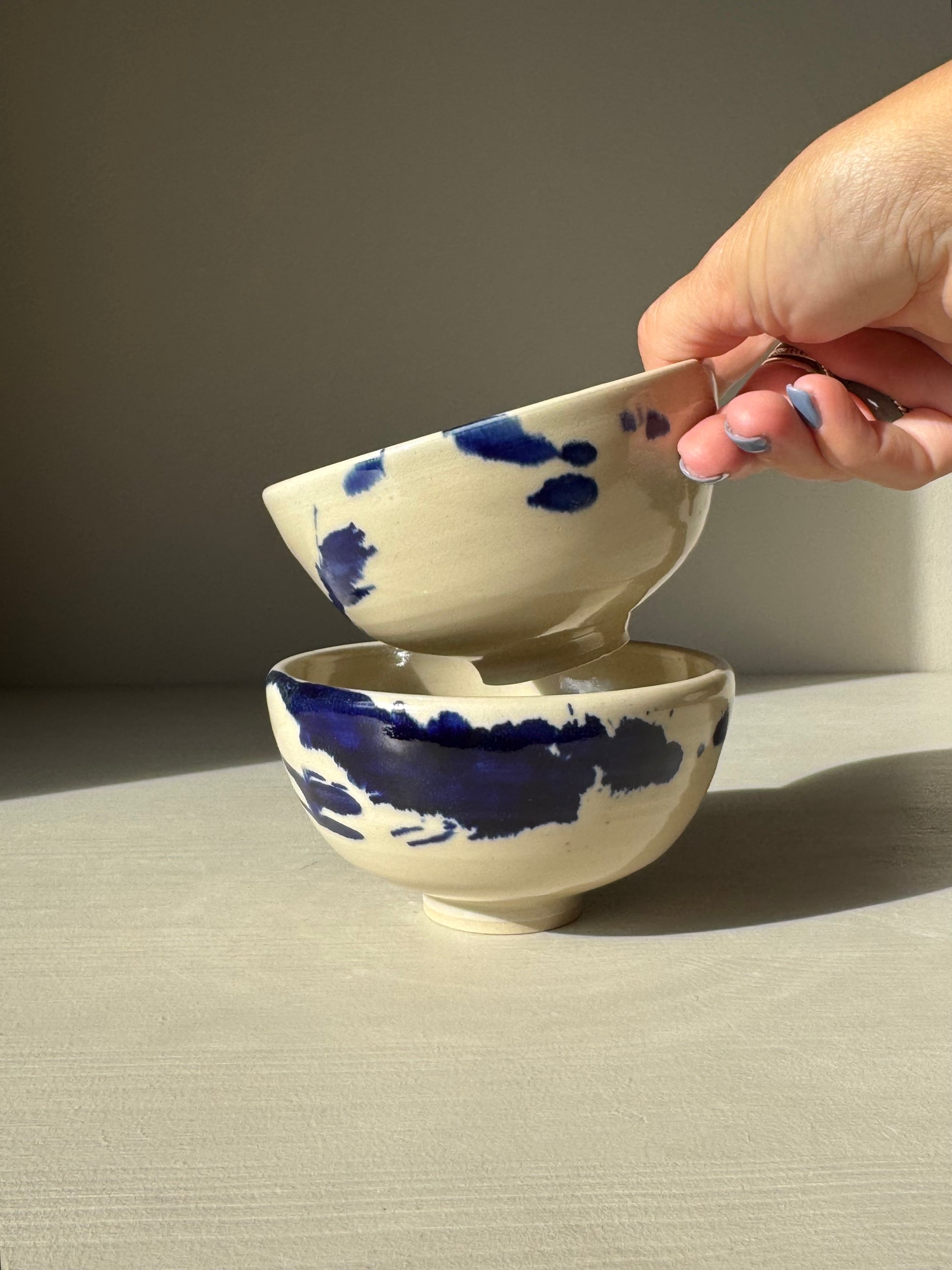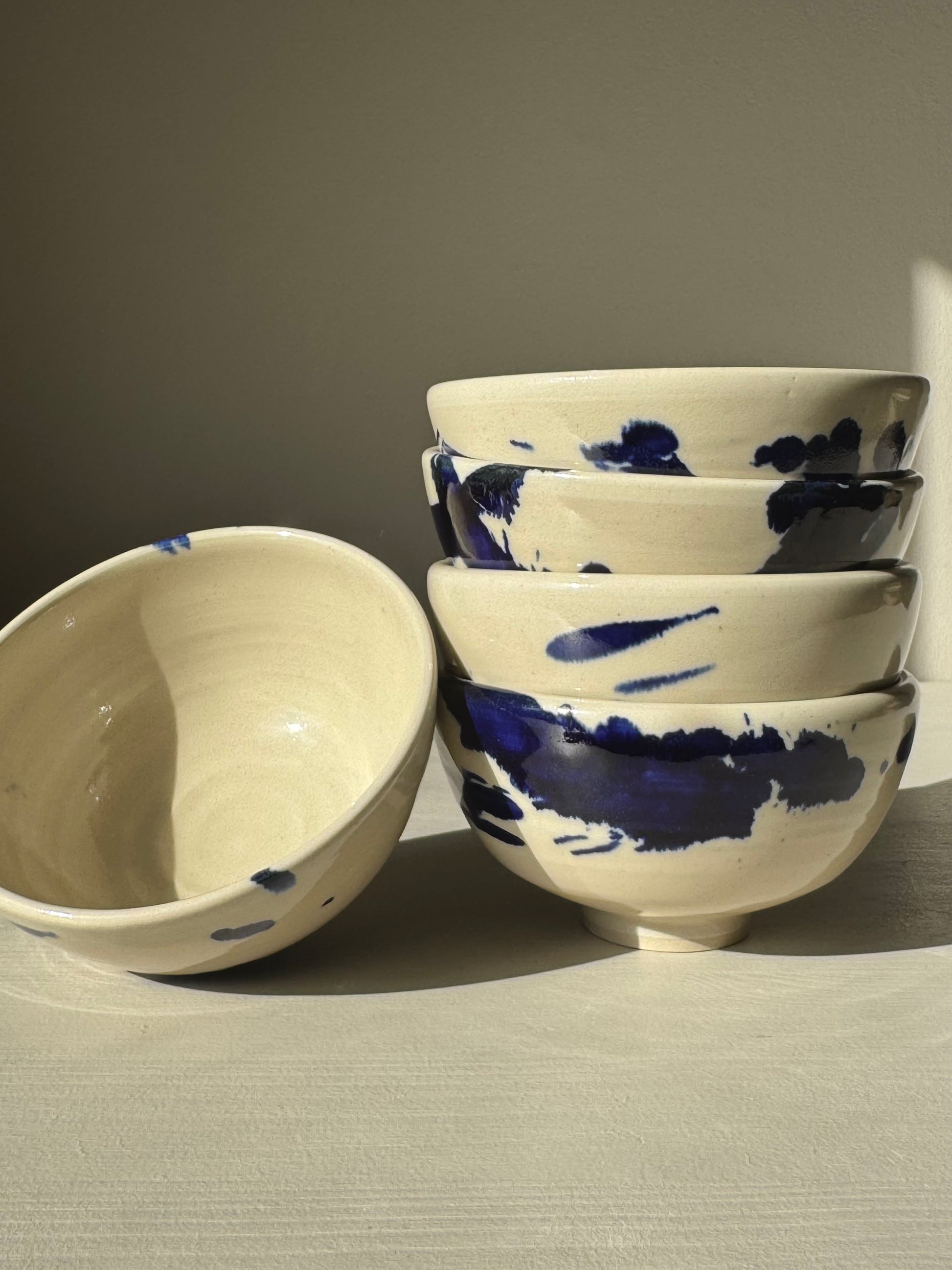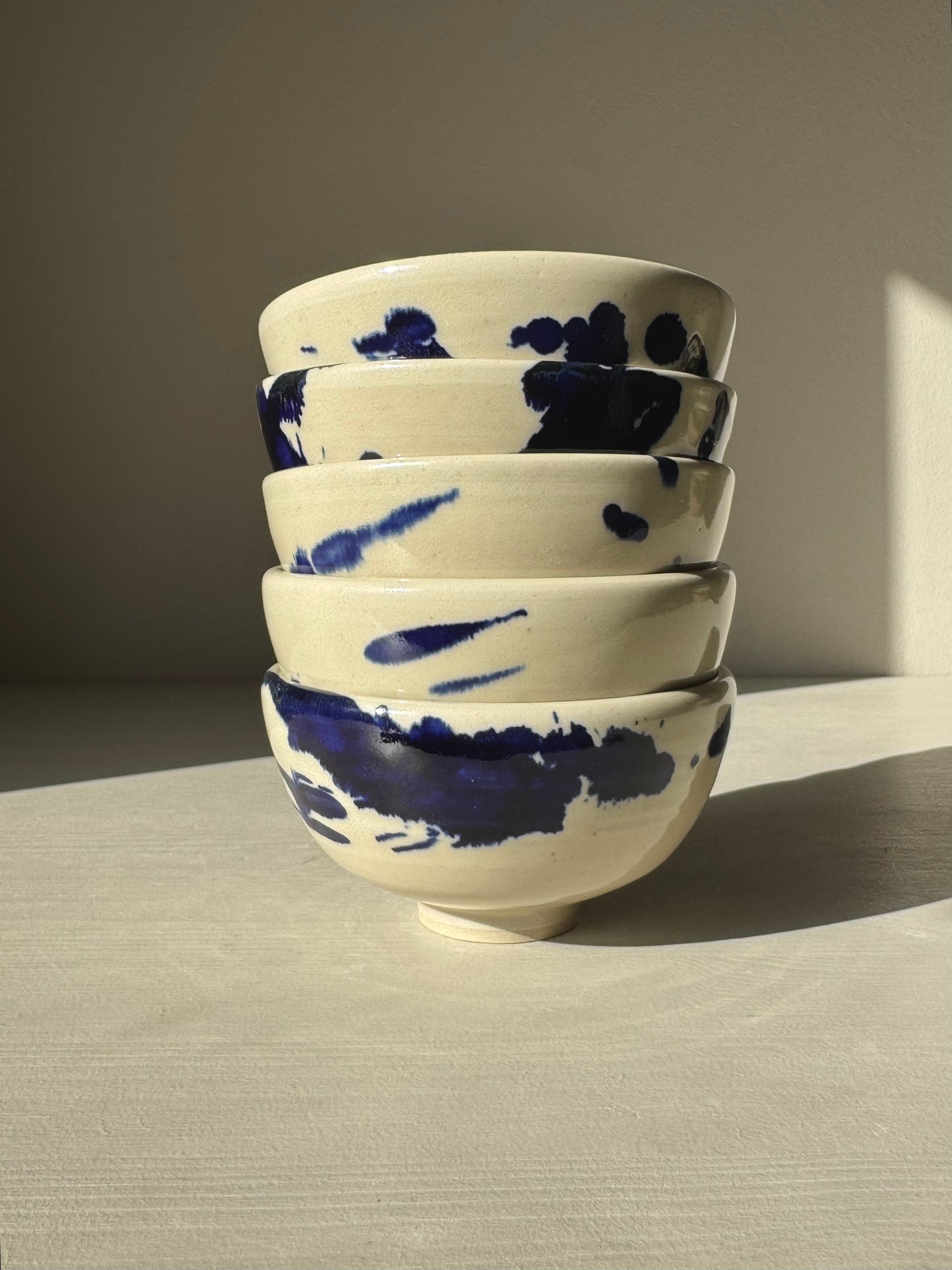 Deze kom is de perfecte balans tussen functioneel en artistiek. De diepe kobaltblauwe spetters geven het een gedurfde, energieke uitstraling, terwijl de zachte, afgeronde vorm hem fijn maakt om vast te houden en dagelijks te gebruiken.