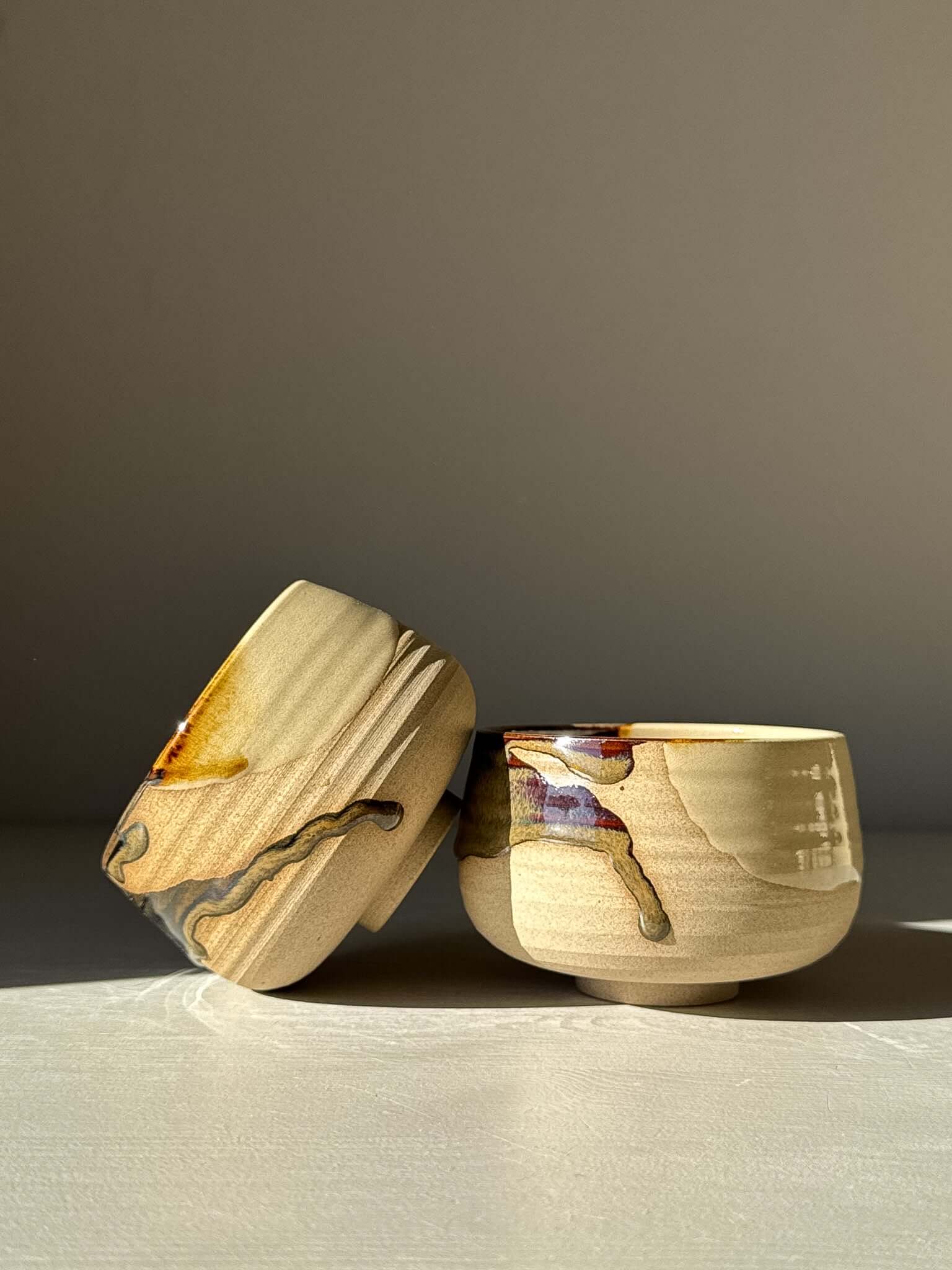 Het glazuur geeft elk kopje zijn eigen kleine verhaal. Sommige lijken op een donkere horizon, andere op zachte rivieren over klei. Het zijn eenvoudige stukken, maar elk kopje heeft een aanwezigheid die verder gaat dan alleen functie.