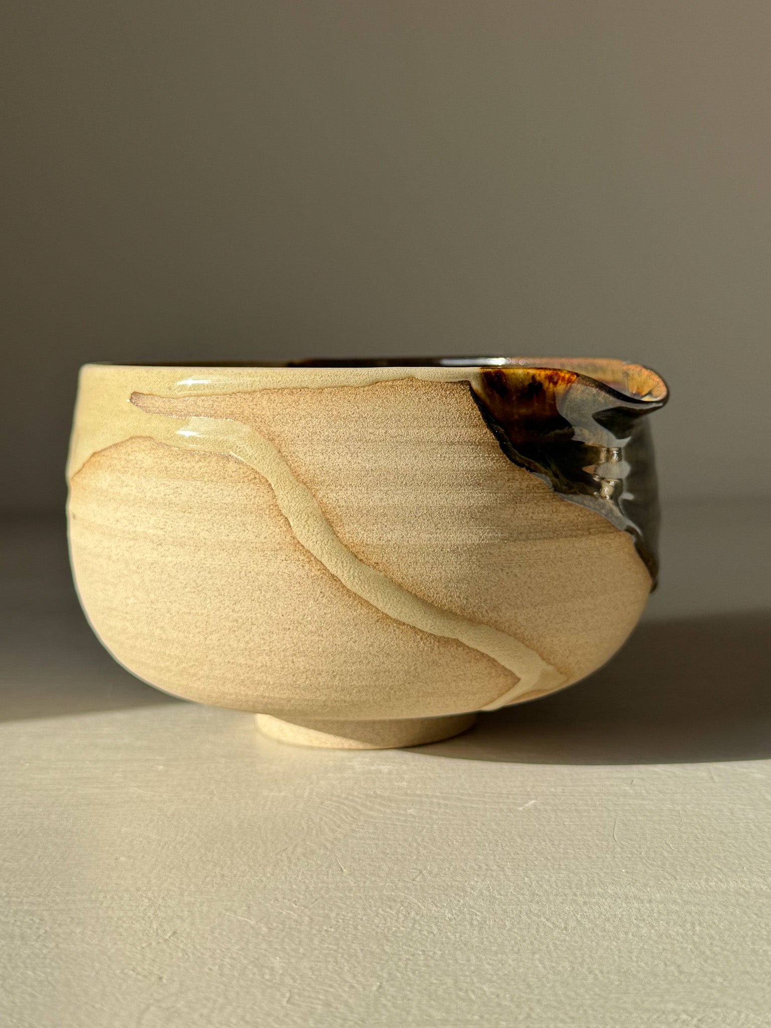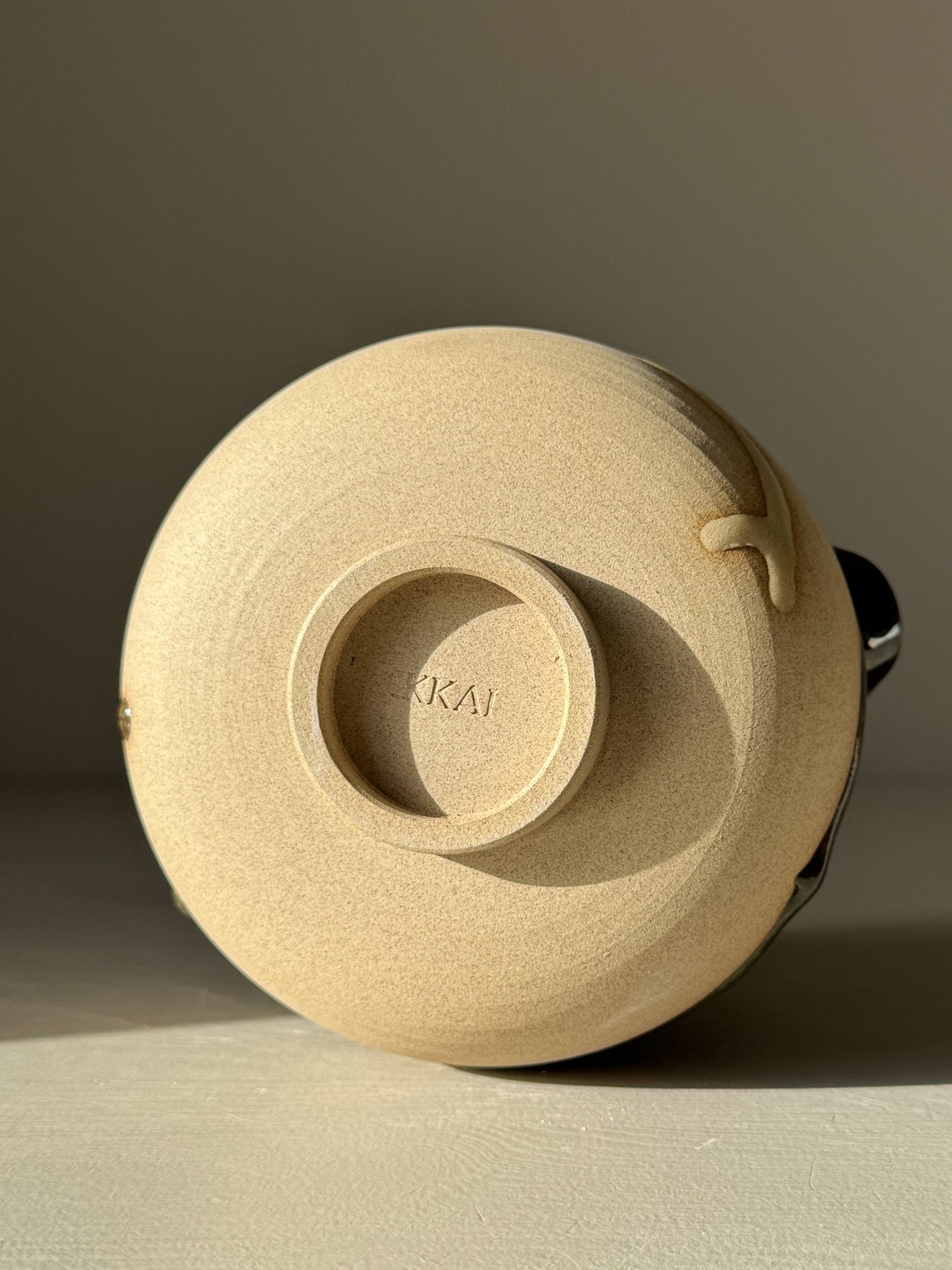 Deze kom draagt contrast in zijn puurste vorm. Het tenmoku-glazuur beweegt krachtig over het oppervlak, terwijl het transparante glazuur verzacht en de natuurlijke warmte van de klei laat zien. Waar de twee elkaar ontmoeten, ontstaan nieuwe landschappen—soms zacht, soms dramatisch—altijd onverwacht, altijd uniek.