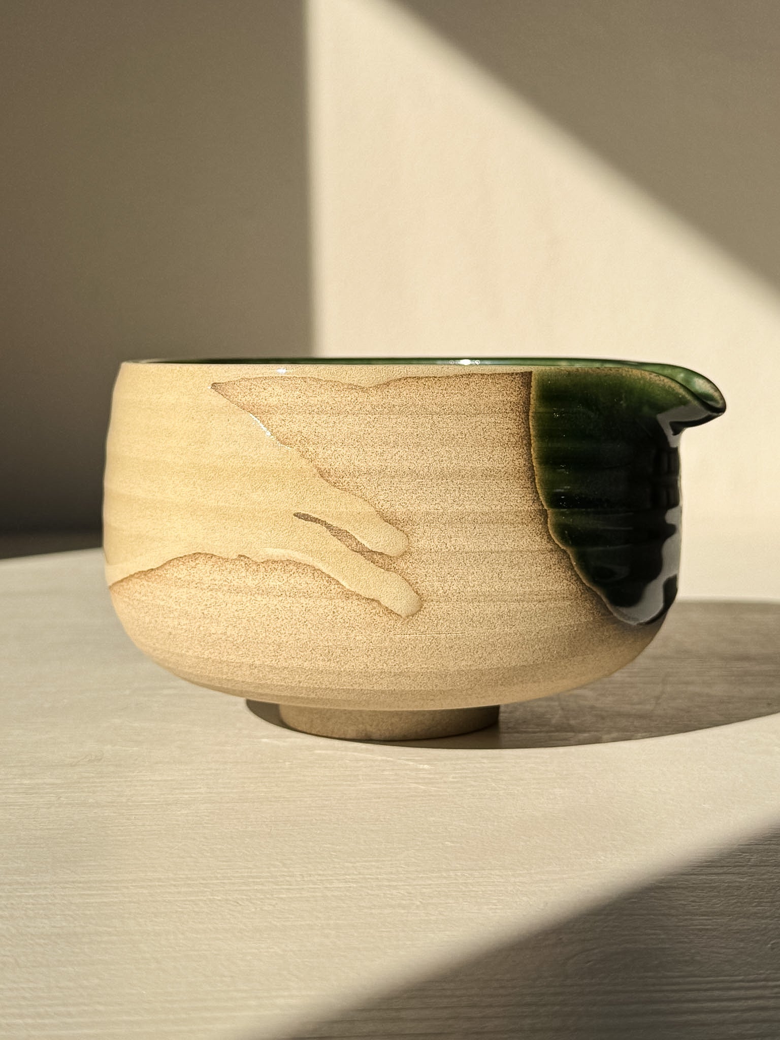 De Mori Matcha Kom met Tuit vangt de rustige energie van het bos — rijke, aardse kleuren die zacht over de warme klei stromen. Het glazuur vormt natuurlijke overgangen tussen groen, bruin en zwart, als kleine landschappen die veranderen met het licht.