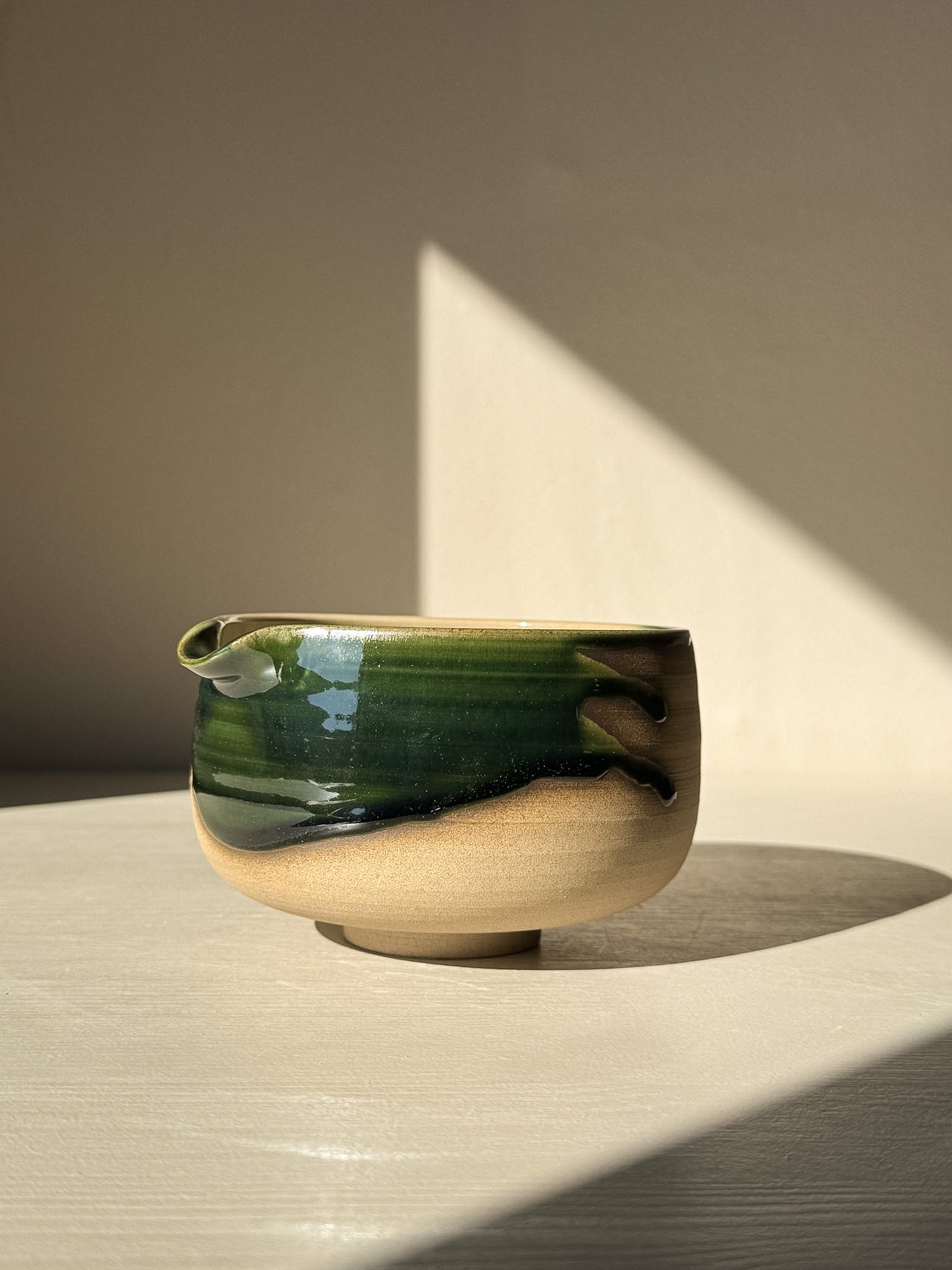 De Mori Matcha Kom met Tuit vangt de rustige energie van het bos — rijke, aardse kleuren die zacht over de warme klei stromen. Het glazuur vormt natuurlijke overgangen tussen groen, bruin en zwart, als kleine landschappen die veranderen met het licht.
