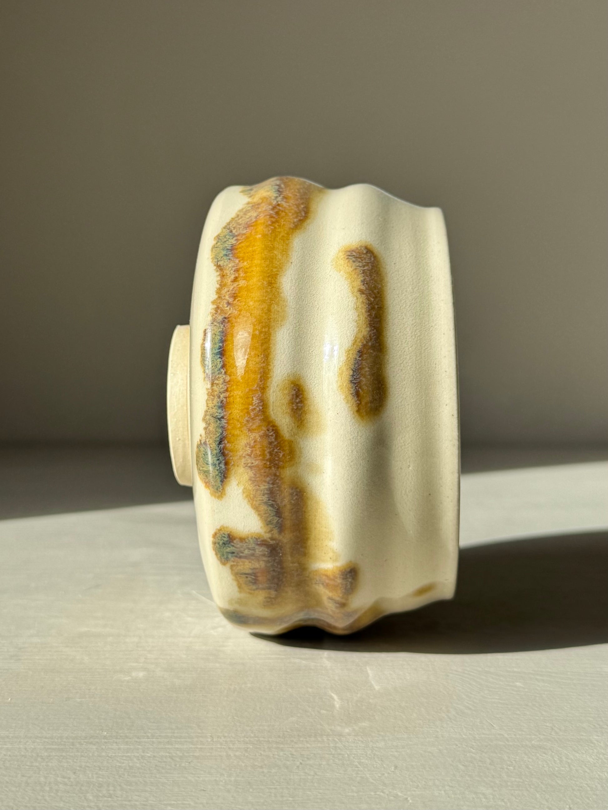 Dit is mijn signature Matcha kom — met de hand gedraaid op de schijf en die herkenbare groeven die zo fijn in de hand liggen. De kom is geglazuurd met een glanzend transparant glazuur, afgewerkt met tenmoku-spletters die overgaan in warme bruintinten en aardse accenten. Elke splash valt anders, waardoor geen twee kommen ooit hetzelfde zijn — en juist dat maakt elke kom zo levendig.