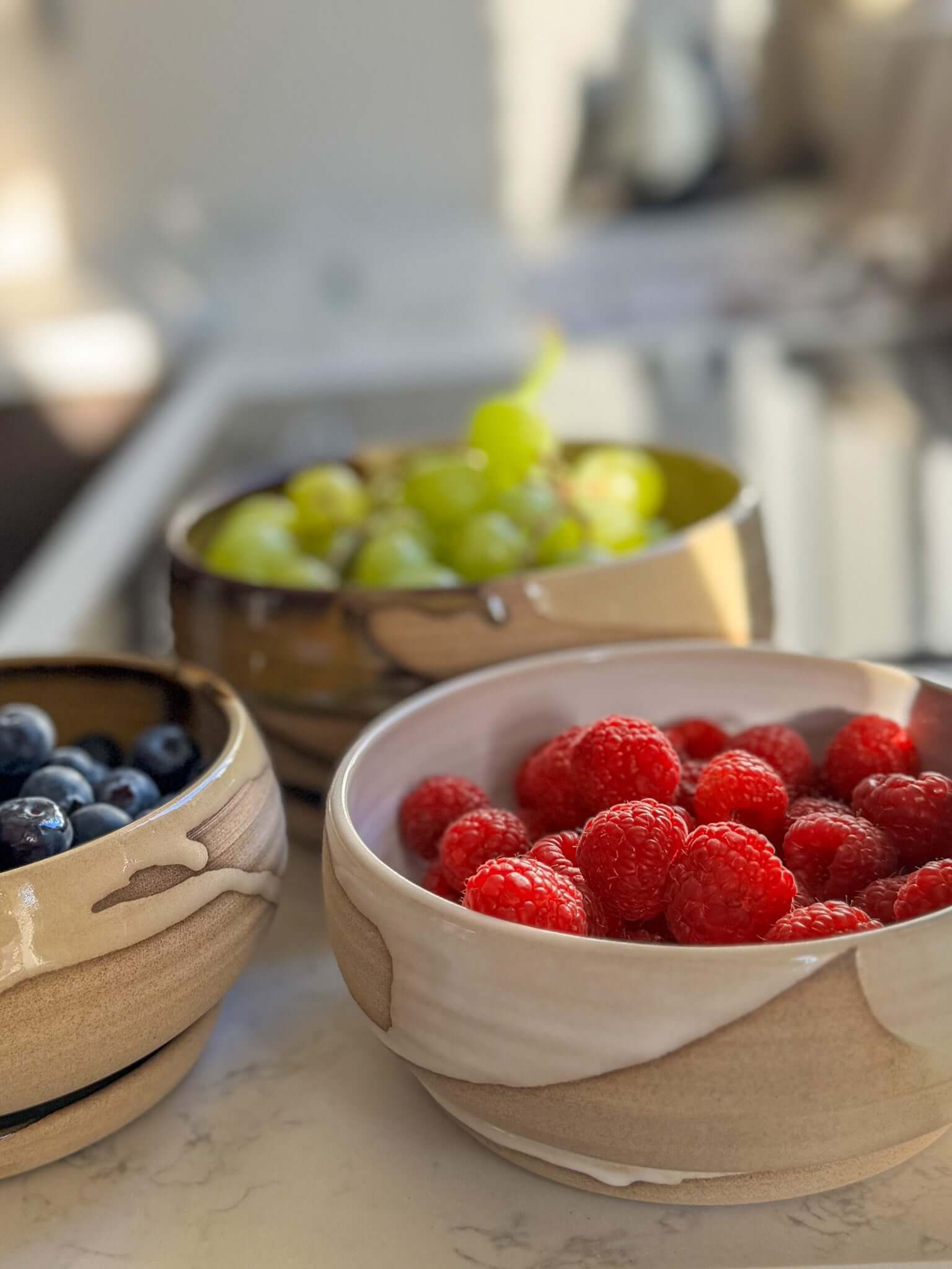 Een ronde bessenkom uit de Yuki Serie, gemaakt voor rustige ochtenden en lange, zonnige middagen. Ontworpen om vers fruit—aardbeien, kersen of druiven—te spoelen en het direct op tafel te zetten. De zachte witte glazuurstroken vloeien speels over de warme toffeeklei en creëren een natuurlijk contrast dat kalm en tijdloos aanvoelt. Het bijpassende schoteltje vangt het overtollige water op, zodat je rechtstreeks van de gootsteen naar ontbijt of terras kunt gaan.
