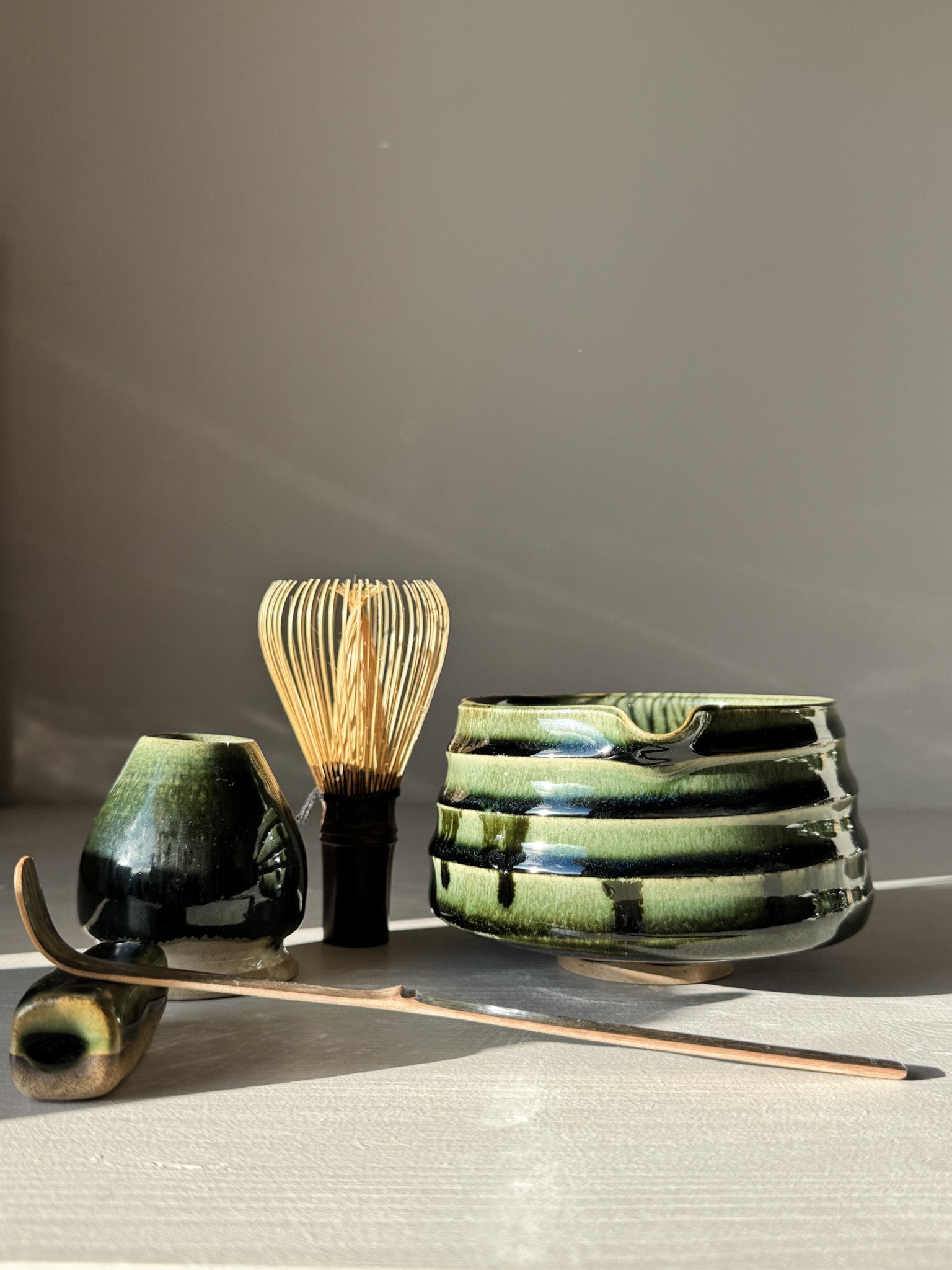 - Vorm: Afgeronde matcha kom met schenktuit en subtiele textuur