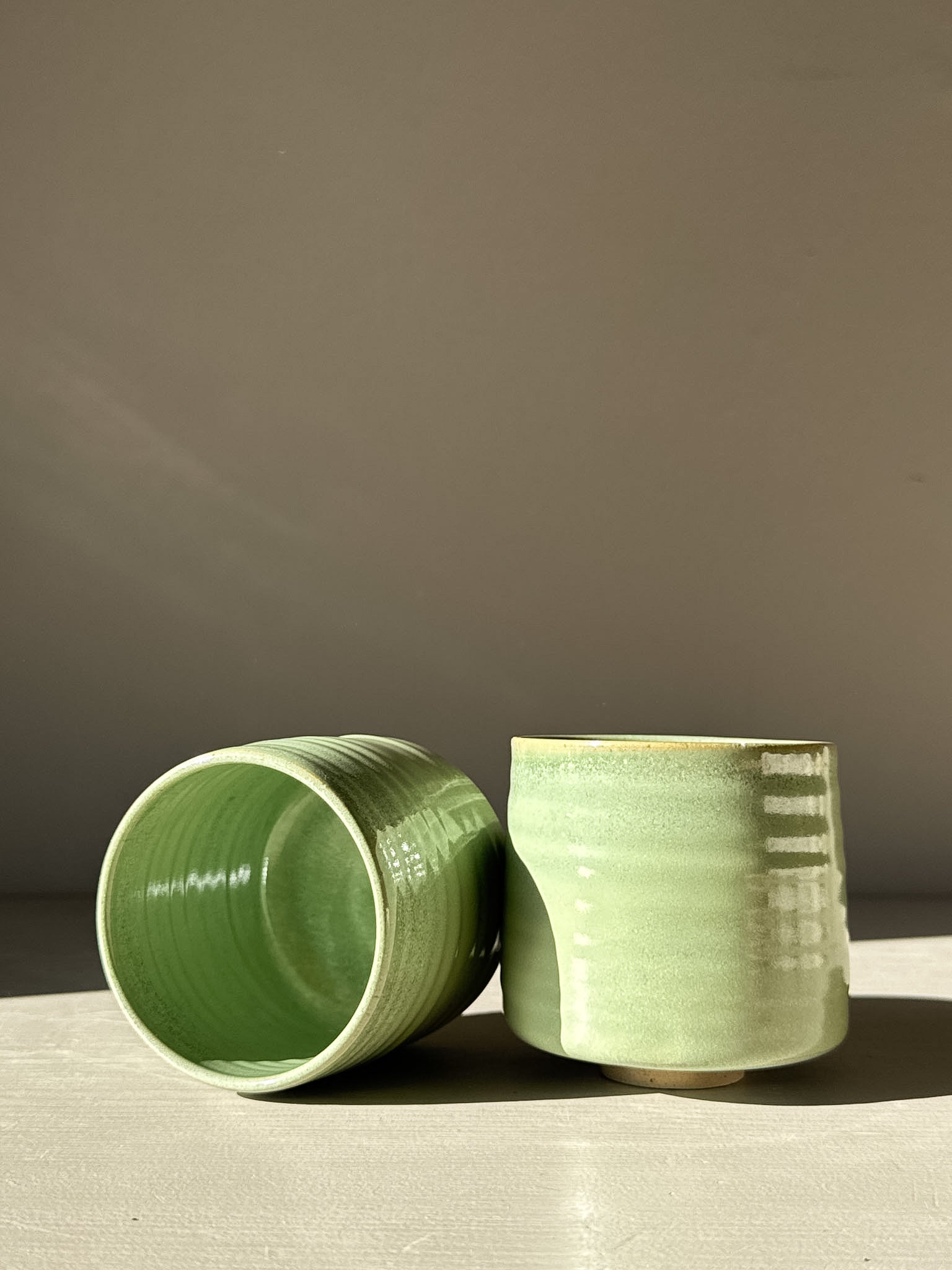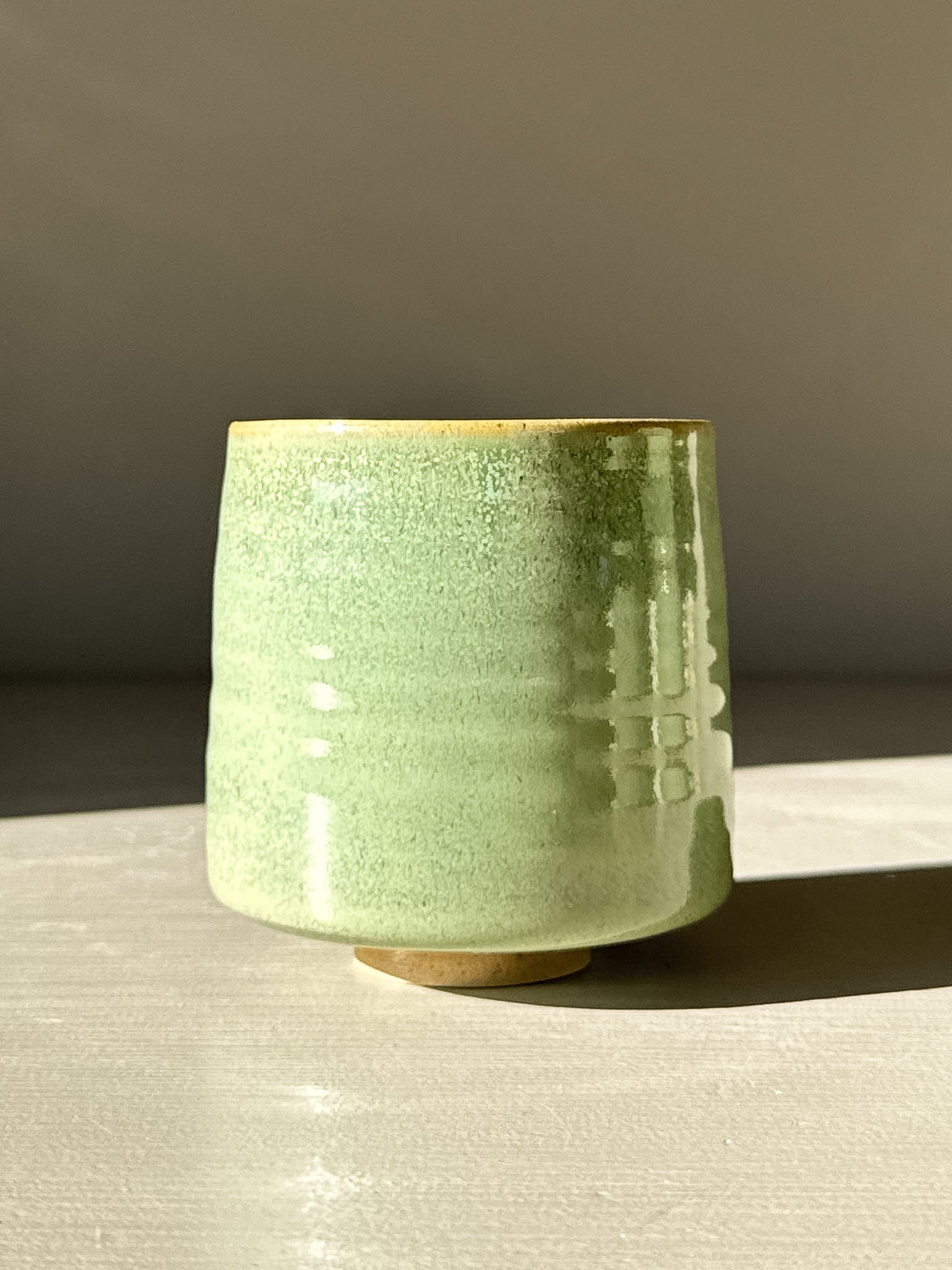 Deze kop heeft een zachte, ronde vorm en is afgewerkt met een gelaagde saliegroene glazuur die subtiel van tint verandert. Tijdens het stoken beweegt het glazuur op een natuurlijke manier, waardoor het iets donkerder wordt rond de rand en zich zacht verzamelt richting de onderkant. De voet is ongeglazuurd gelaten, wat zorgt voor warmte en balans in het geheel.
