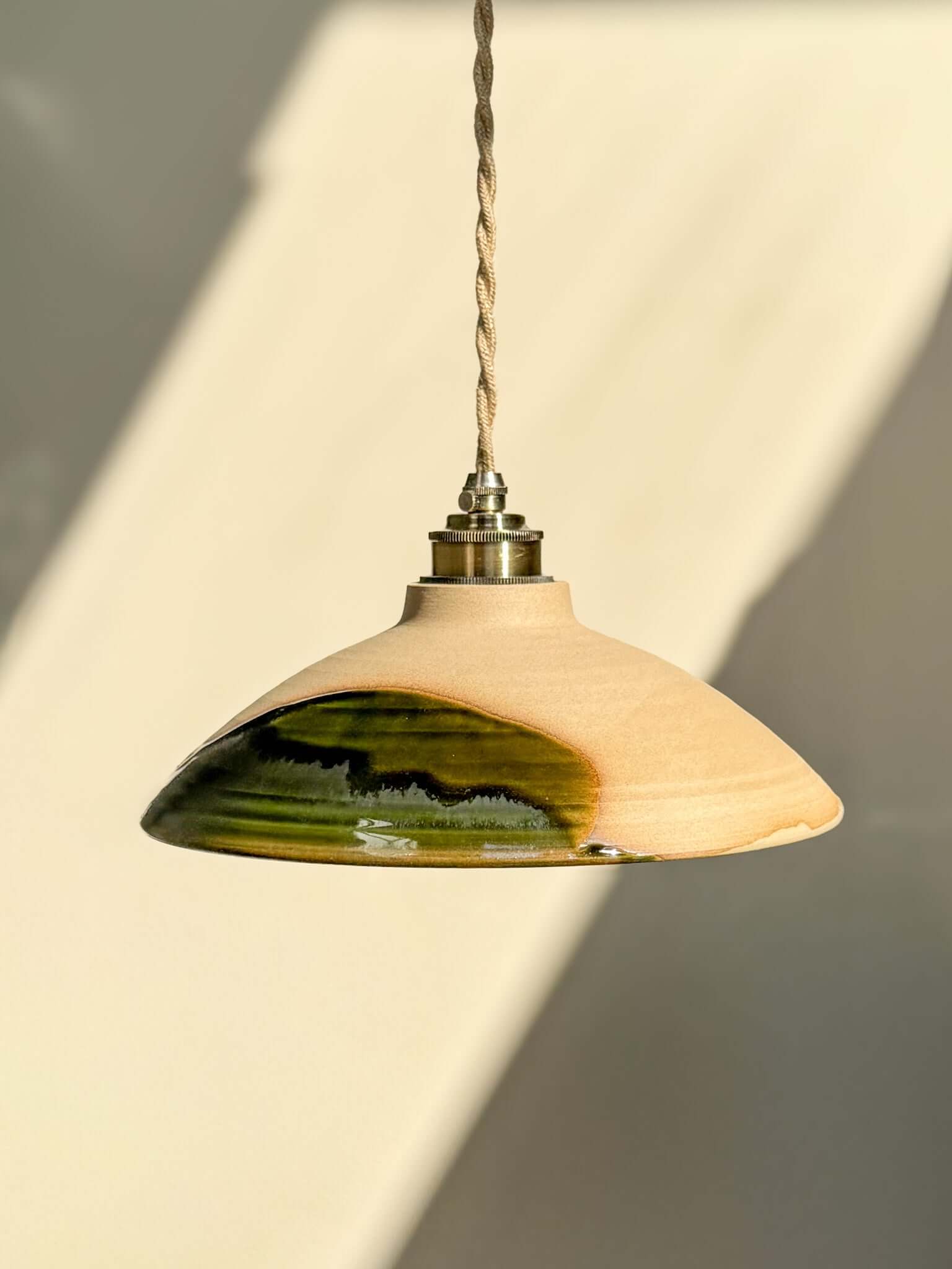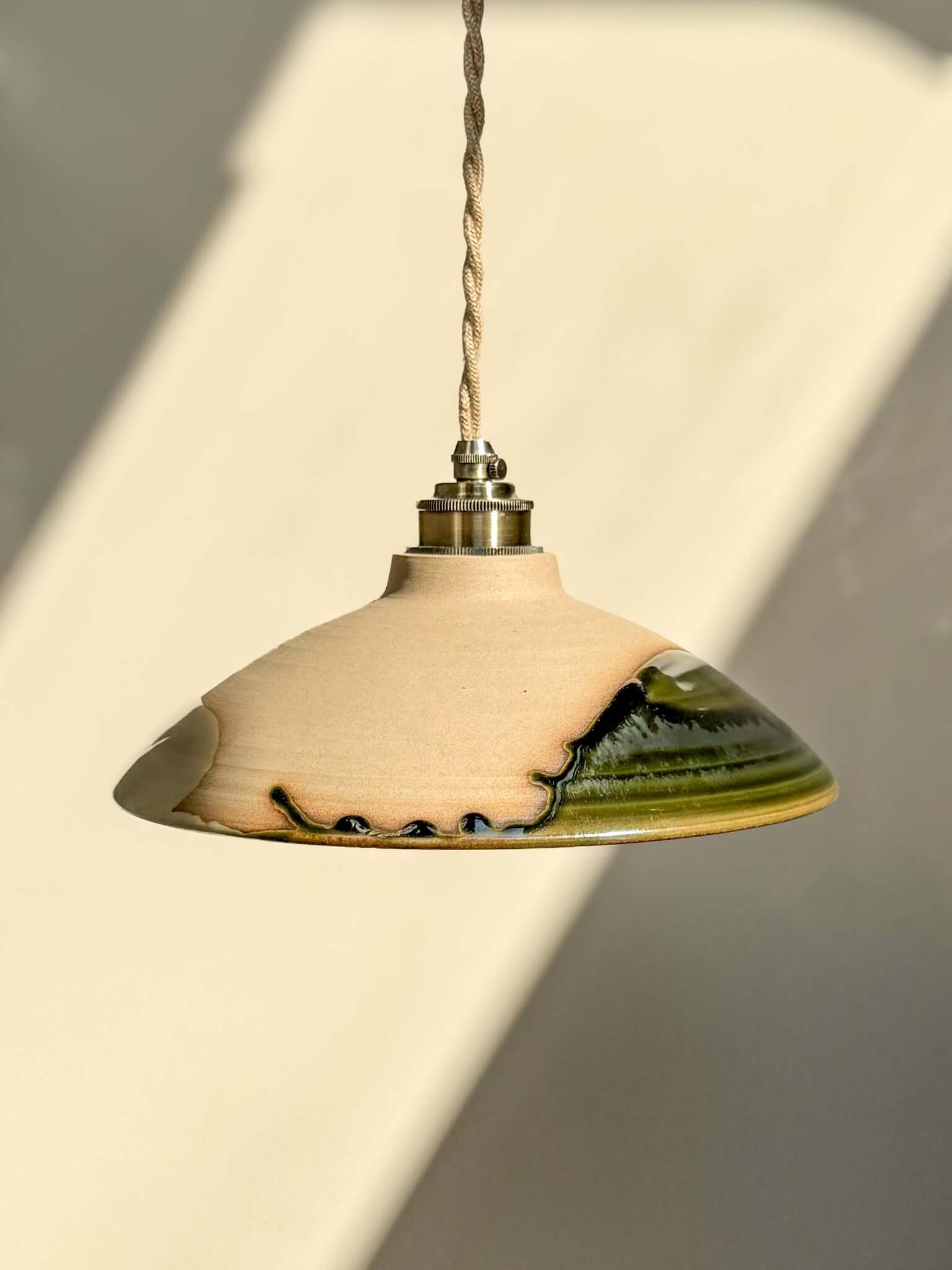 This lampshade from the Mori Series brings together soft natural tones and the rich depth of forest green. The glossy glaze flows inside like filtered light through leaves, while the outside stays raw and tactile, showing the quiet beauty of the clay itself.