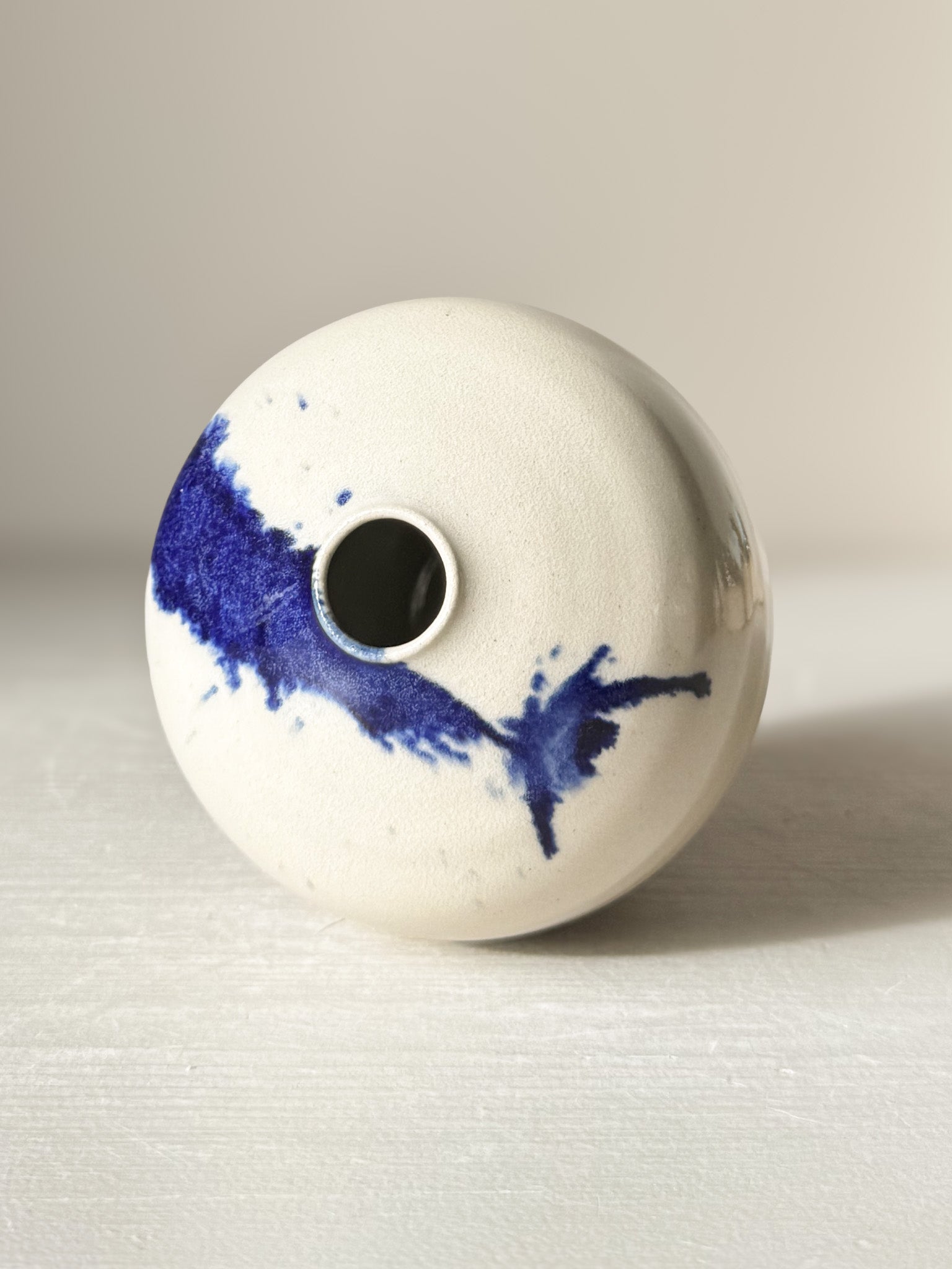 This Ceramic vase is part of my Gosu Series, inspired by the art of cobalt blue glazing. Bold, hand-splashed cobalt blue accents paired with a glossy clear glaze create a clean, modern design that fits beautifully into any space. Each splash of blue is applied by hand, making every vase unique and full of character.