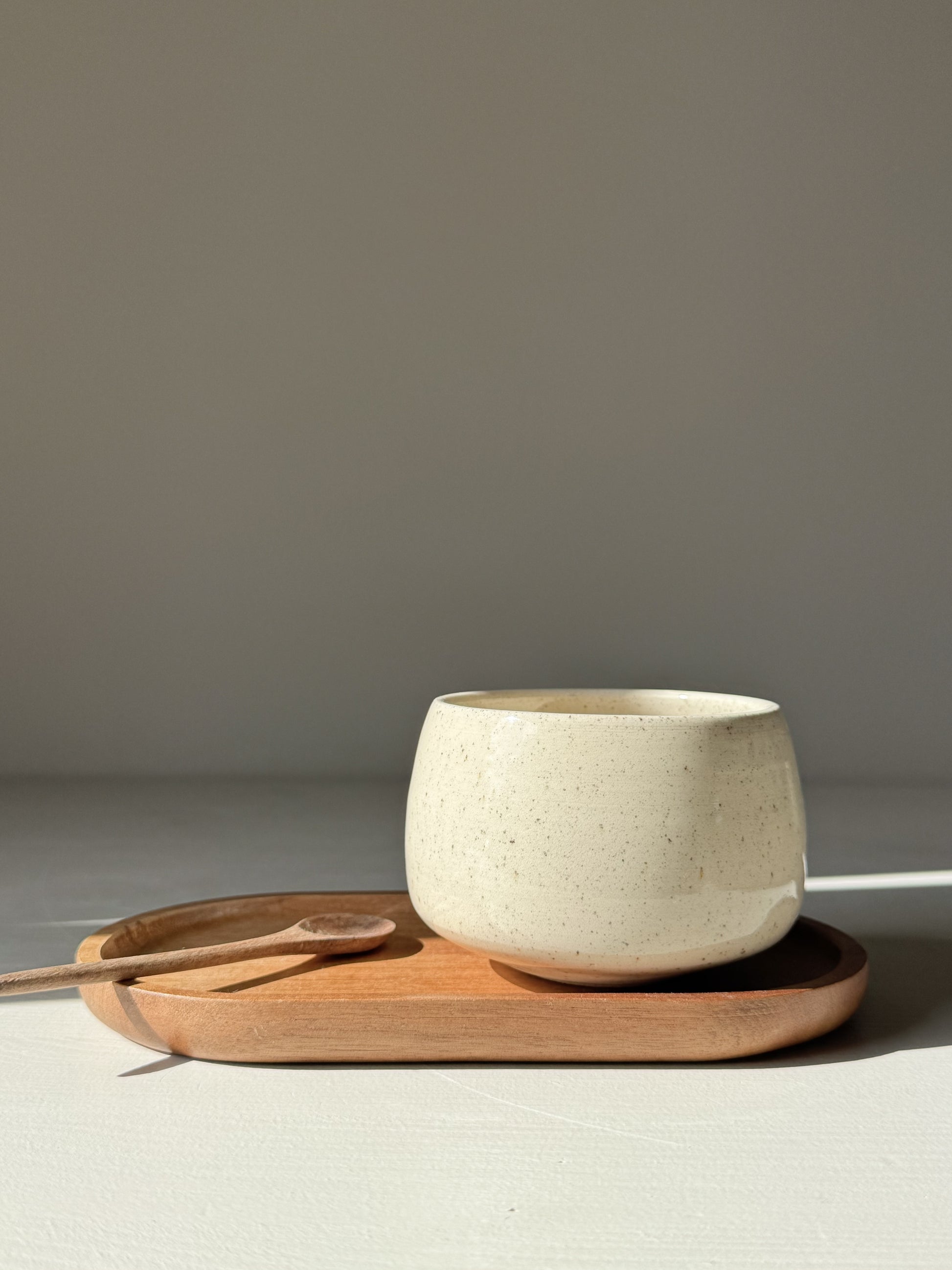 This little cup feels like sunlight on a quiet morning. I threw it on the wheel with a soft, rounded shape that rests naturally in your hand, then gave it a clear glaze so the warm clay and tiny freckles could stay in full view. Every swirl of the wheel is still there—just softened by a gentle sheen.