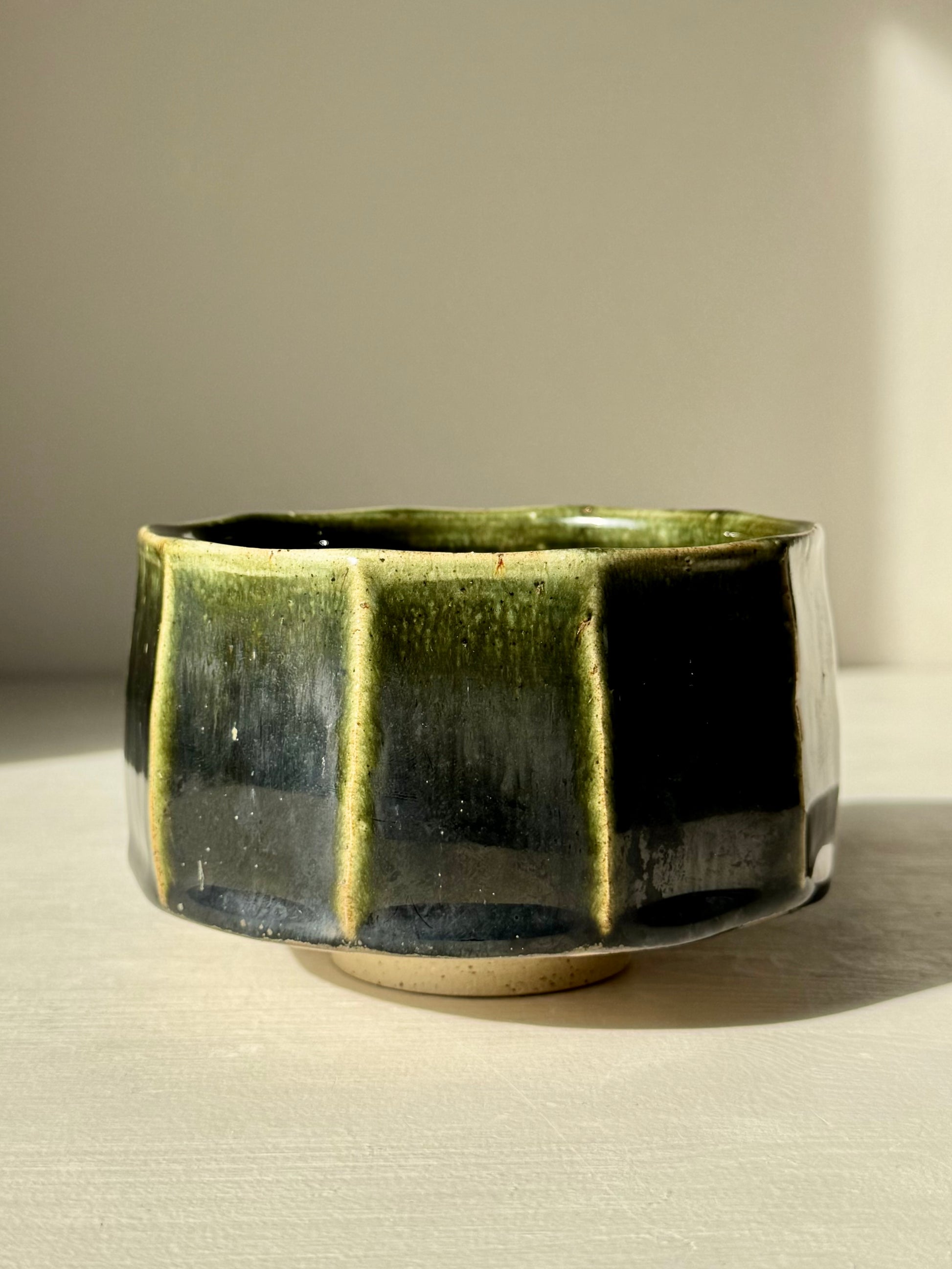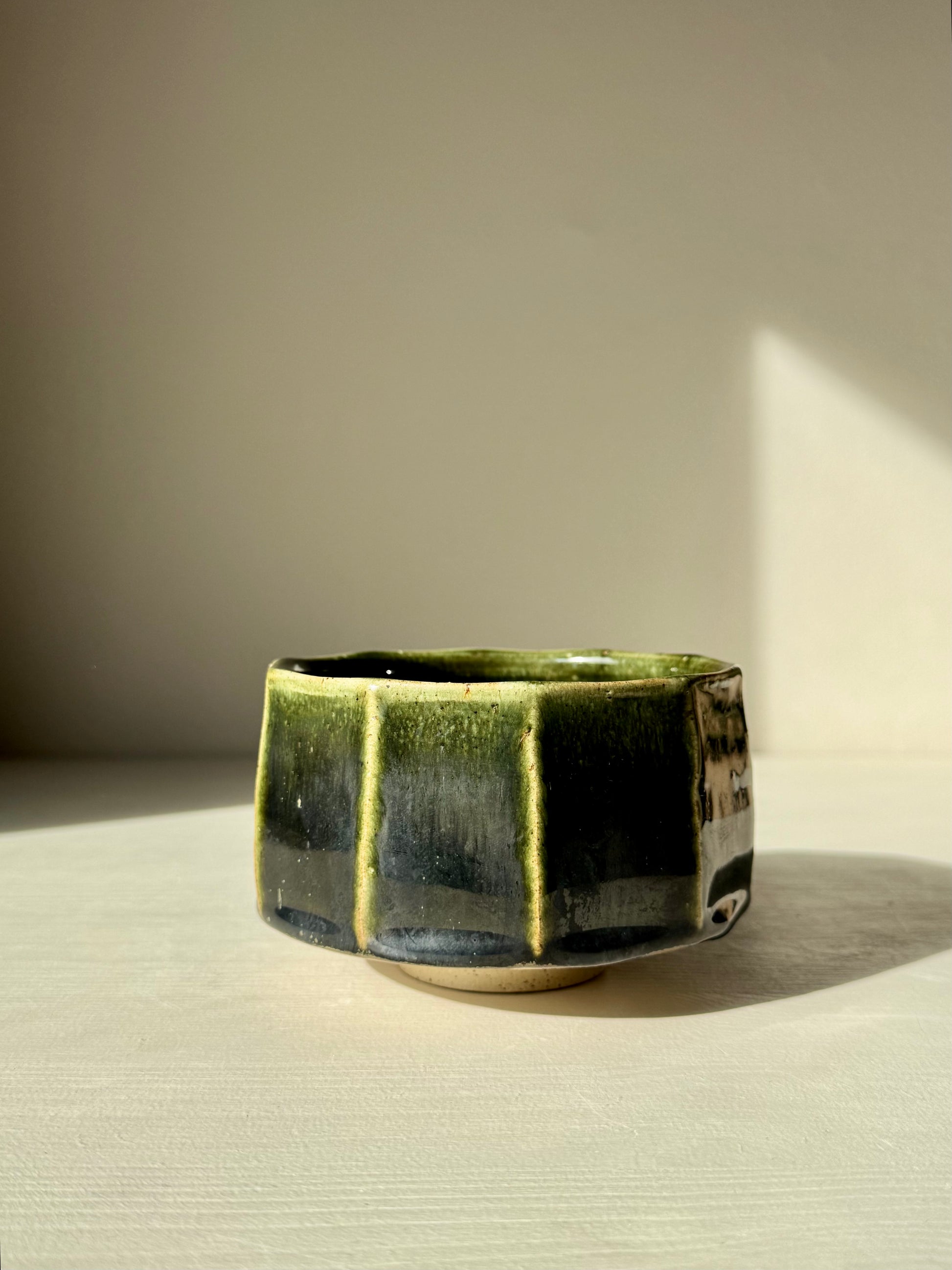 Part of the Hinoki Series, this faceted matcha bowl came out of the kiln with deep green glaze drips that caught me completely off guard—in the best way. The glaze moved in ways I couldn’t have planned, catching on each carved line.