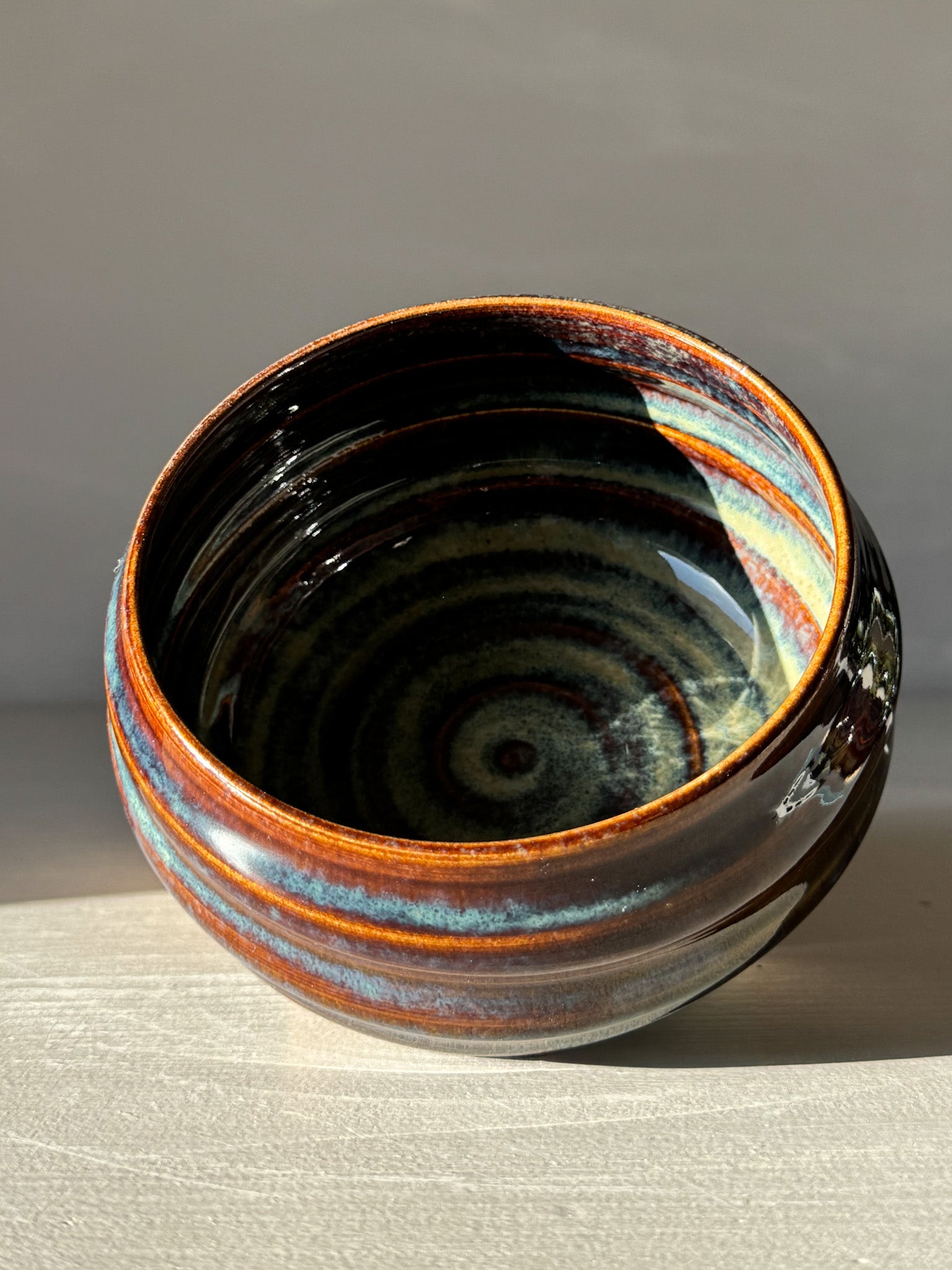 The glaze on this bowl has a way of telling its own story — deep browns flowing into ocean blues, as if capturing movement in stillness. It’s not polished or perfect, and that’s the point. Each mark and variation makes it feel alive, like a piece that could only ever exist once.