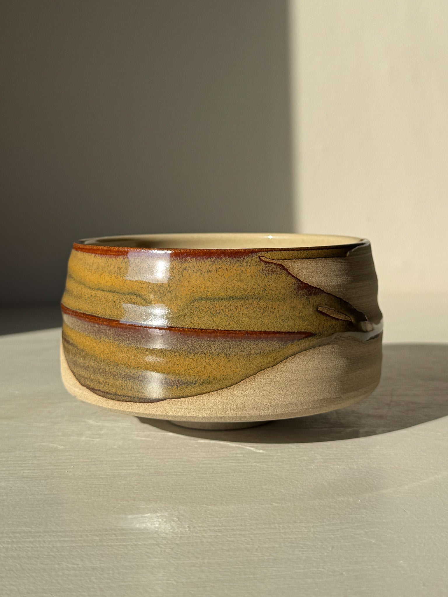 Part of the Inyo Series, this handmade matcha bowl brings together two very different glazes—dark, glossy tenmoku and soft, transparent clear—that meet and flow across warm stoneware clay. Each bowl is wheel-thrown in my home studio and glazed by hand, allowing the surfaces to overlap in ways that are always spontaneous, layered, and unique.
