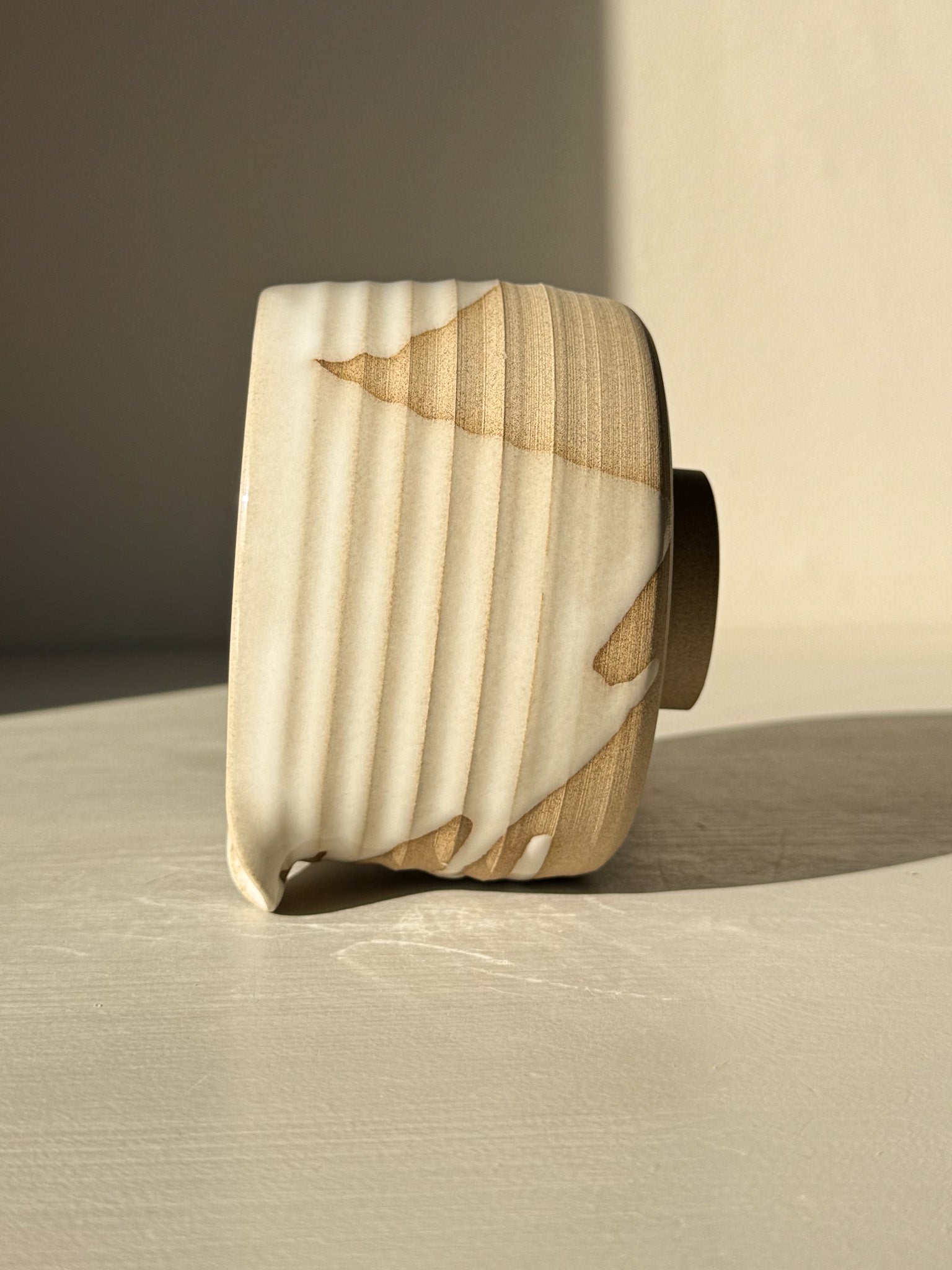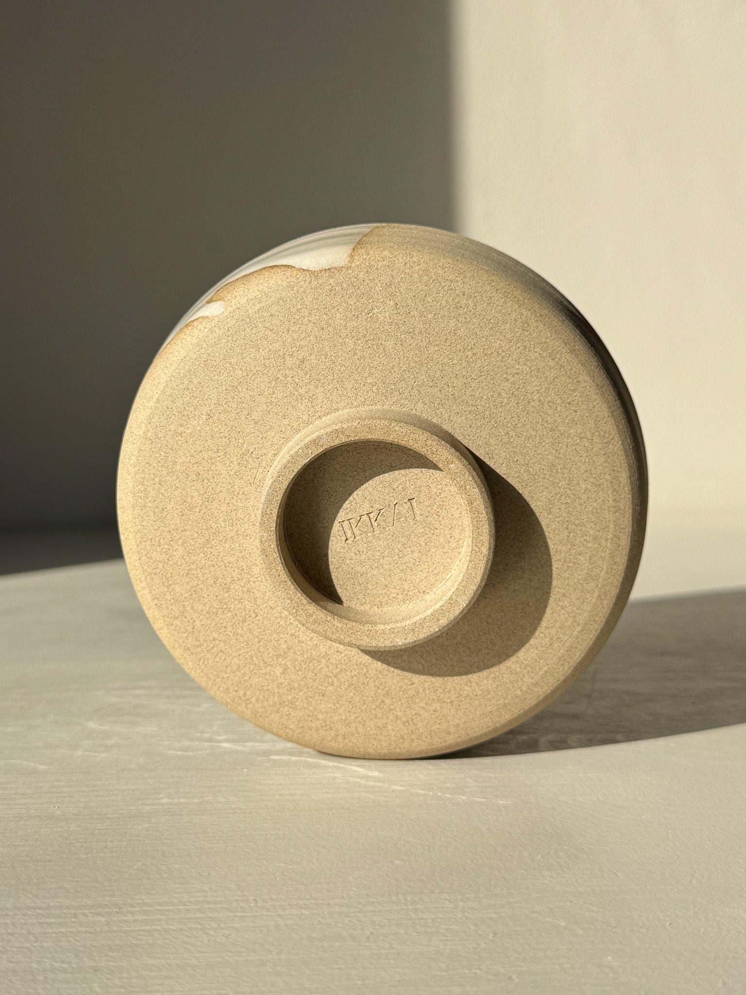 The toffee clay is left partially unglazed, allowing the natural surface to show through—subtle throwing lines, gentle curves, and the earthy warmth of the clay itself. The glossy white glaze flows softly across the form, like snow melting over stone, creating a unique pattern on every piece.