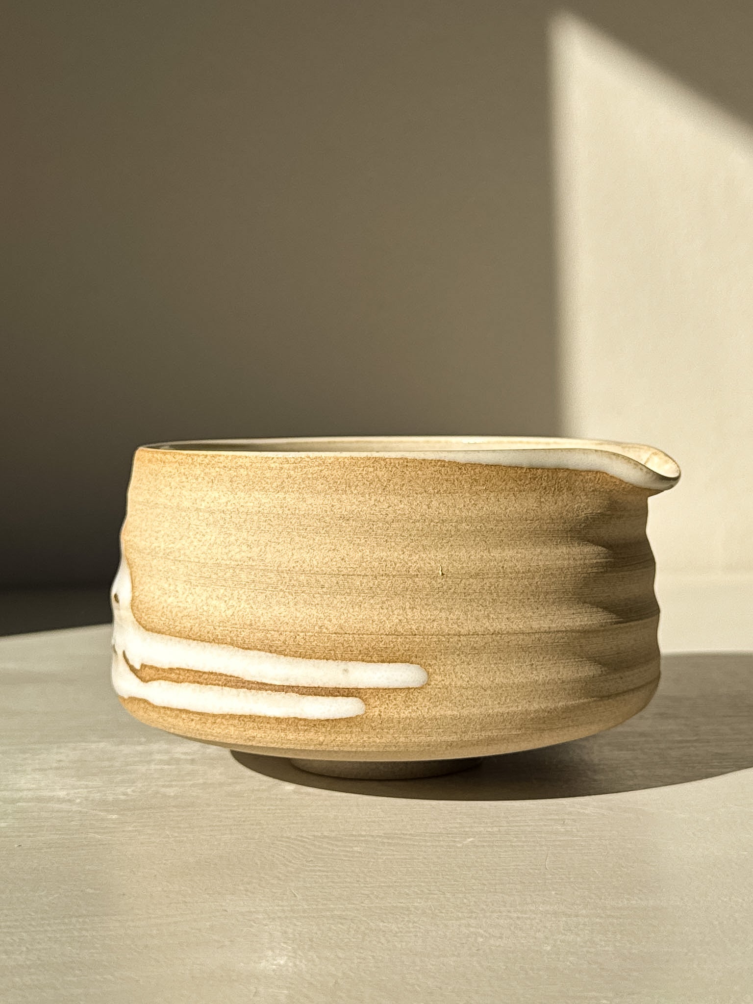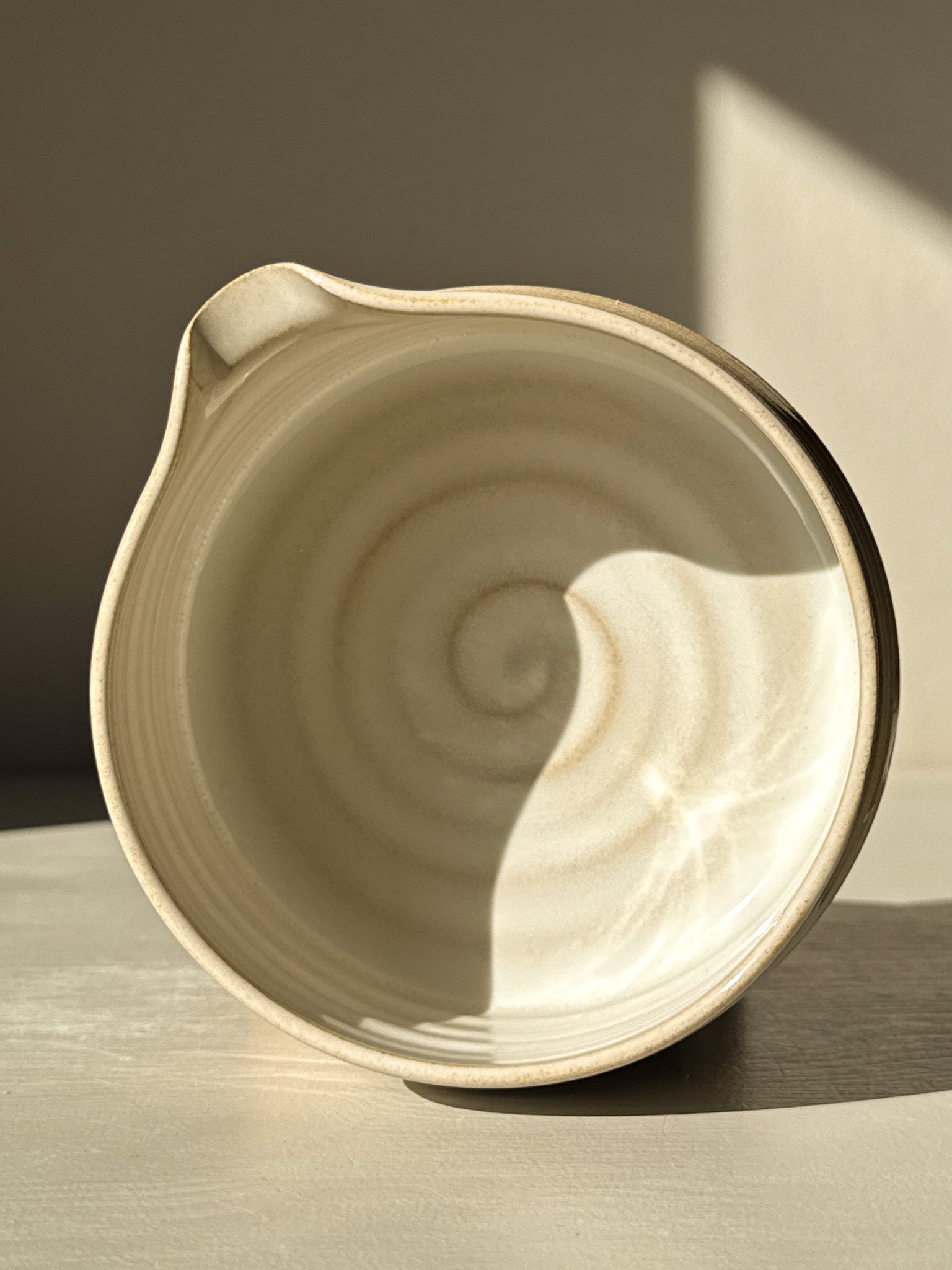 The spout gives it a quiet practicality — perfect for pouring matcha, sauces, or dressings — while the rounded form and small foot keep it balanced and comfortable in the hand.