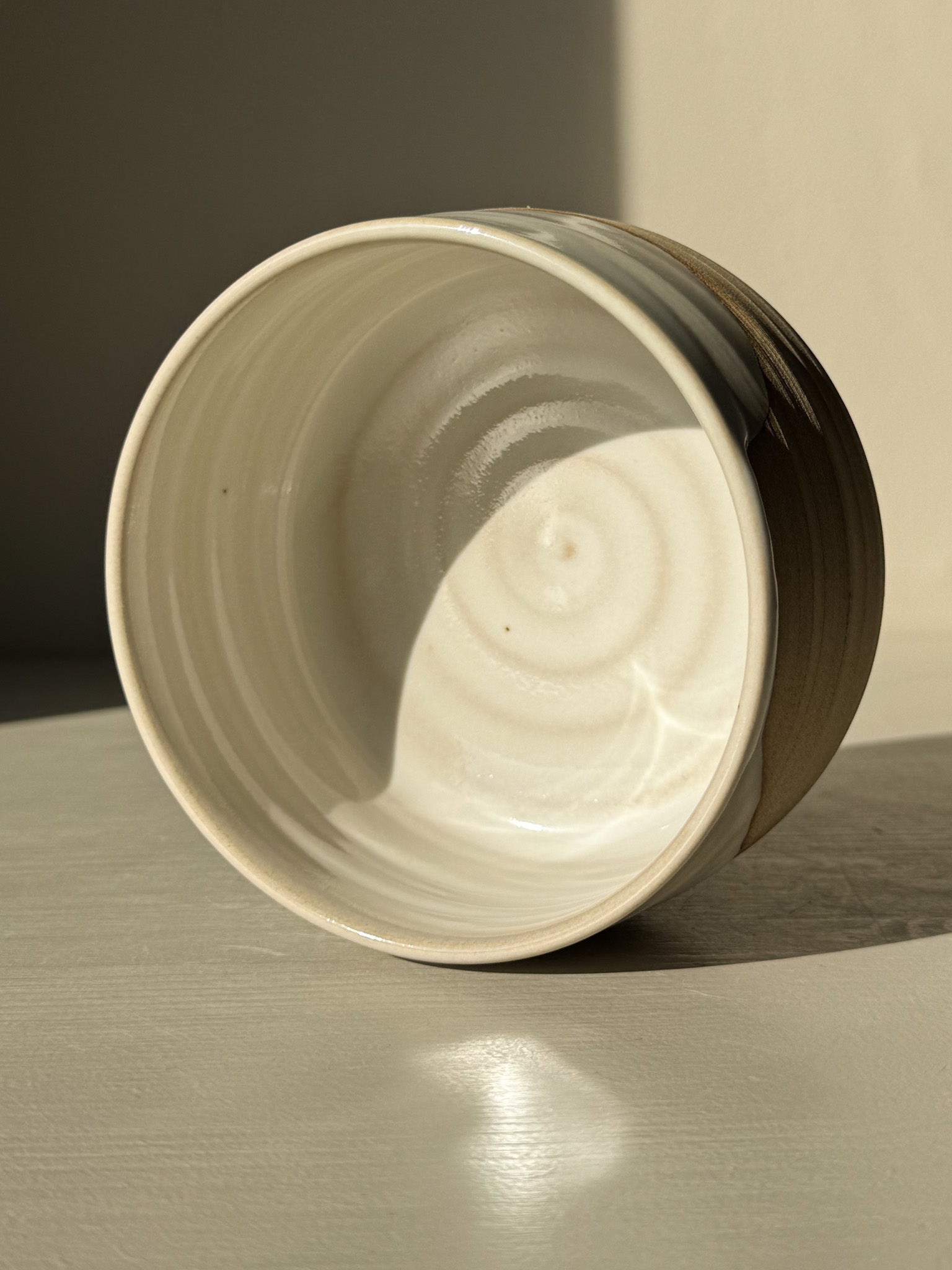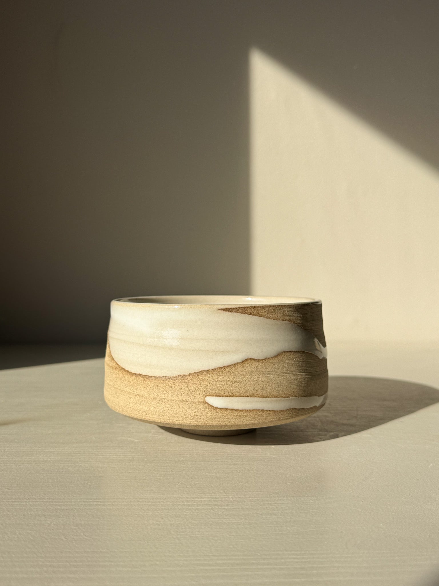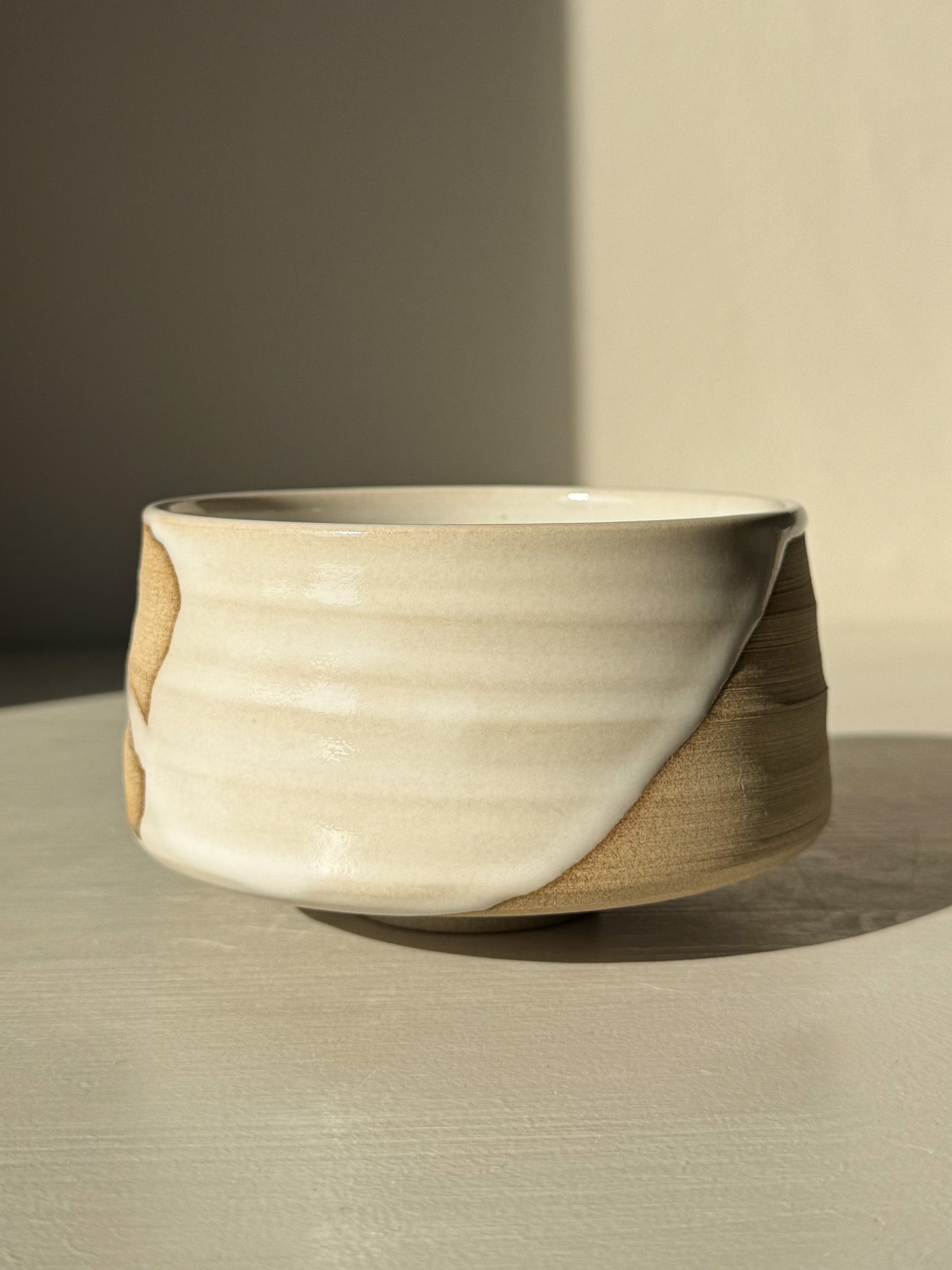 The toffee clay is left partially unglazed, allowing the natural surface to show through—subtle throwing lines, gentle curves, and the earthy warmth of the clay itself. The glossy white glaze flows softly across the form, like snow melting over stone, creating a unique pattern on every piece.