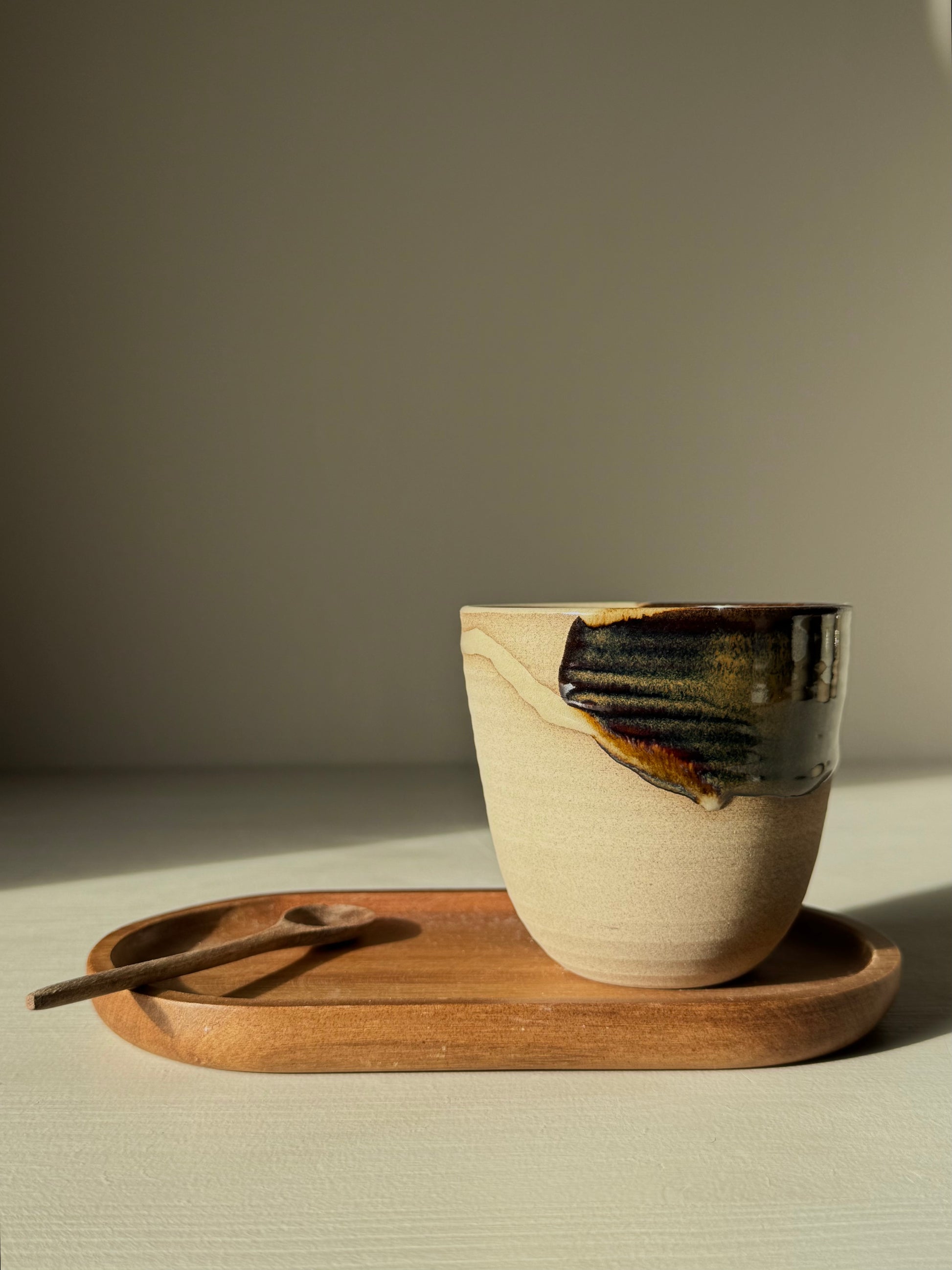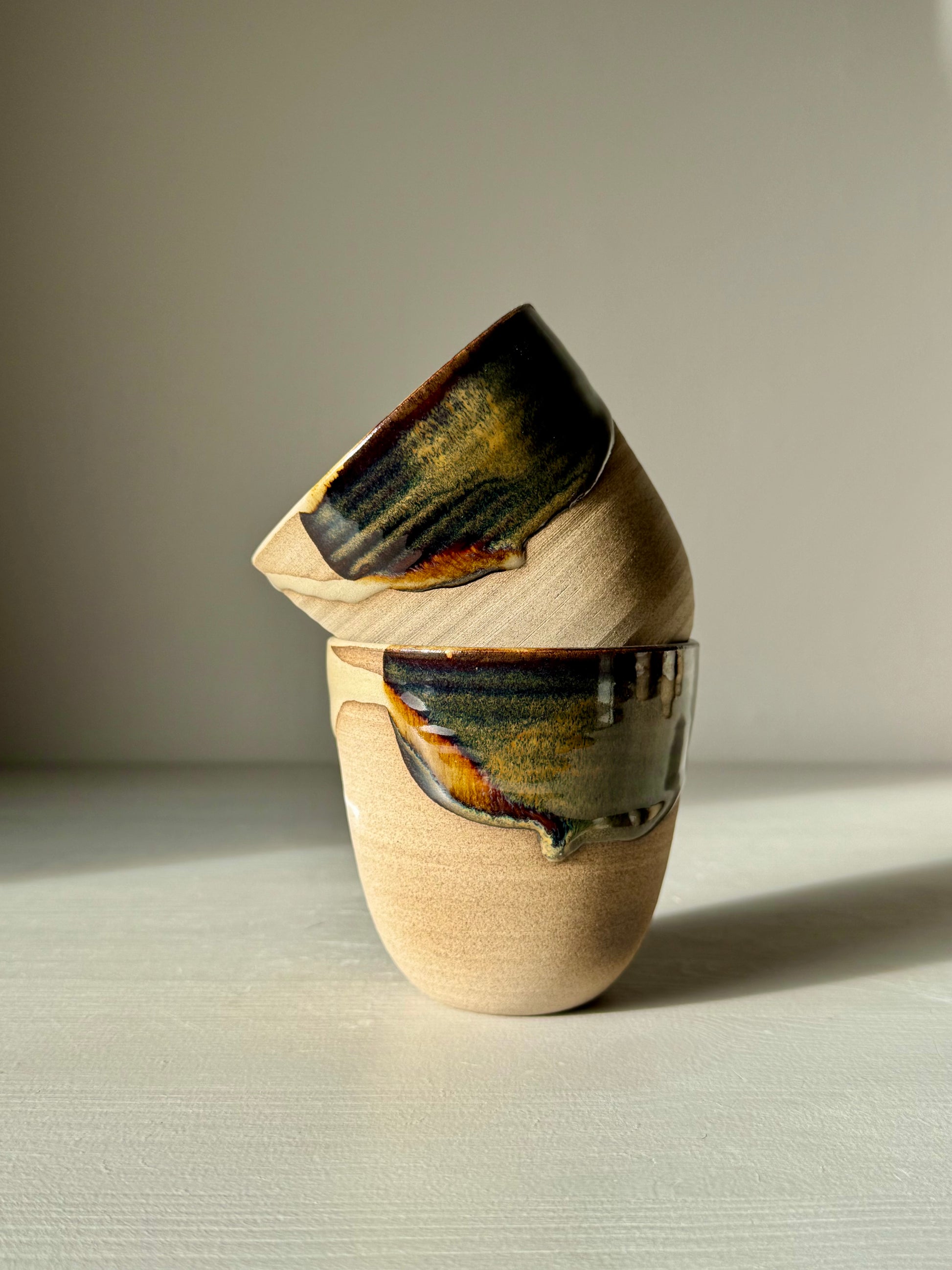 I like how these cups feel honest — simple, but full of quiet character. The glazes move differently on every piece, forming soft lines and deep tones that catch the light just right.