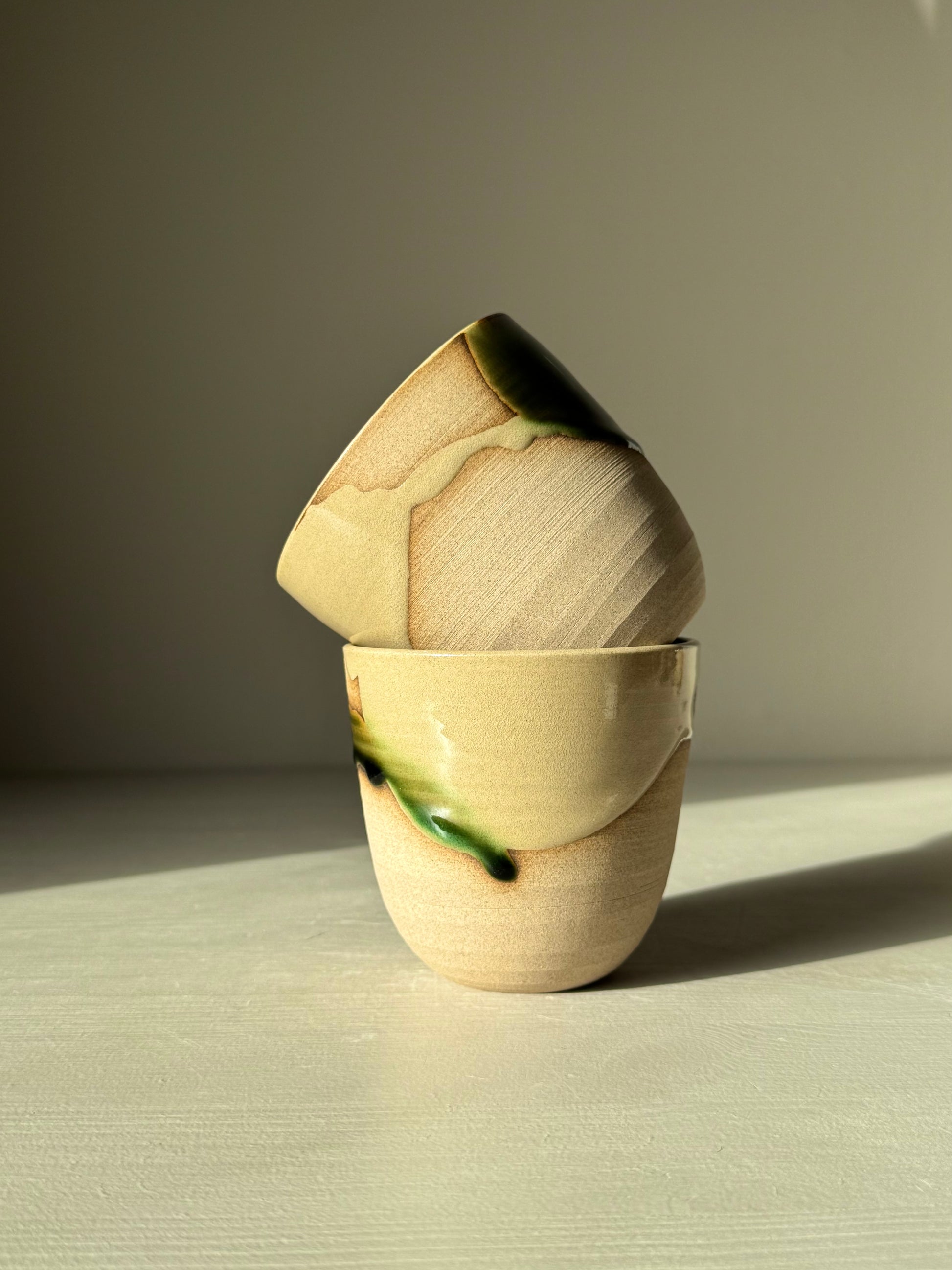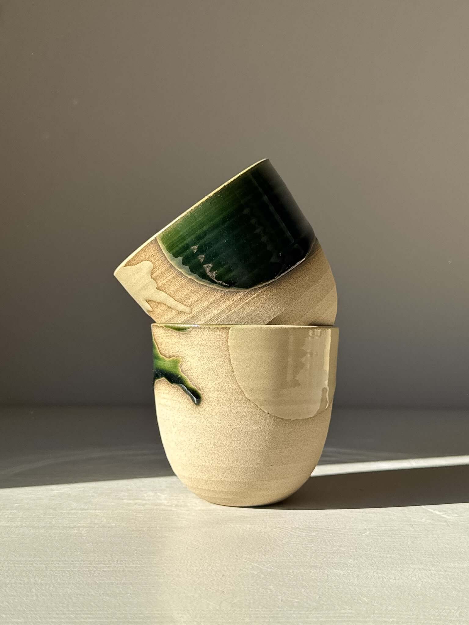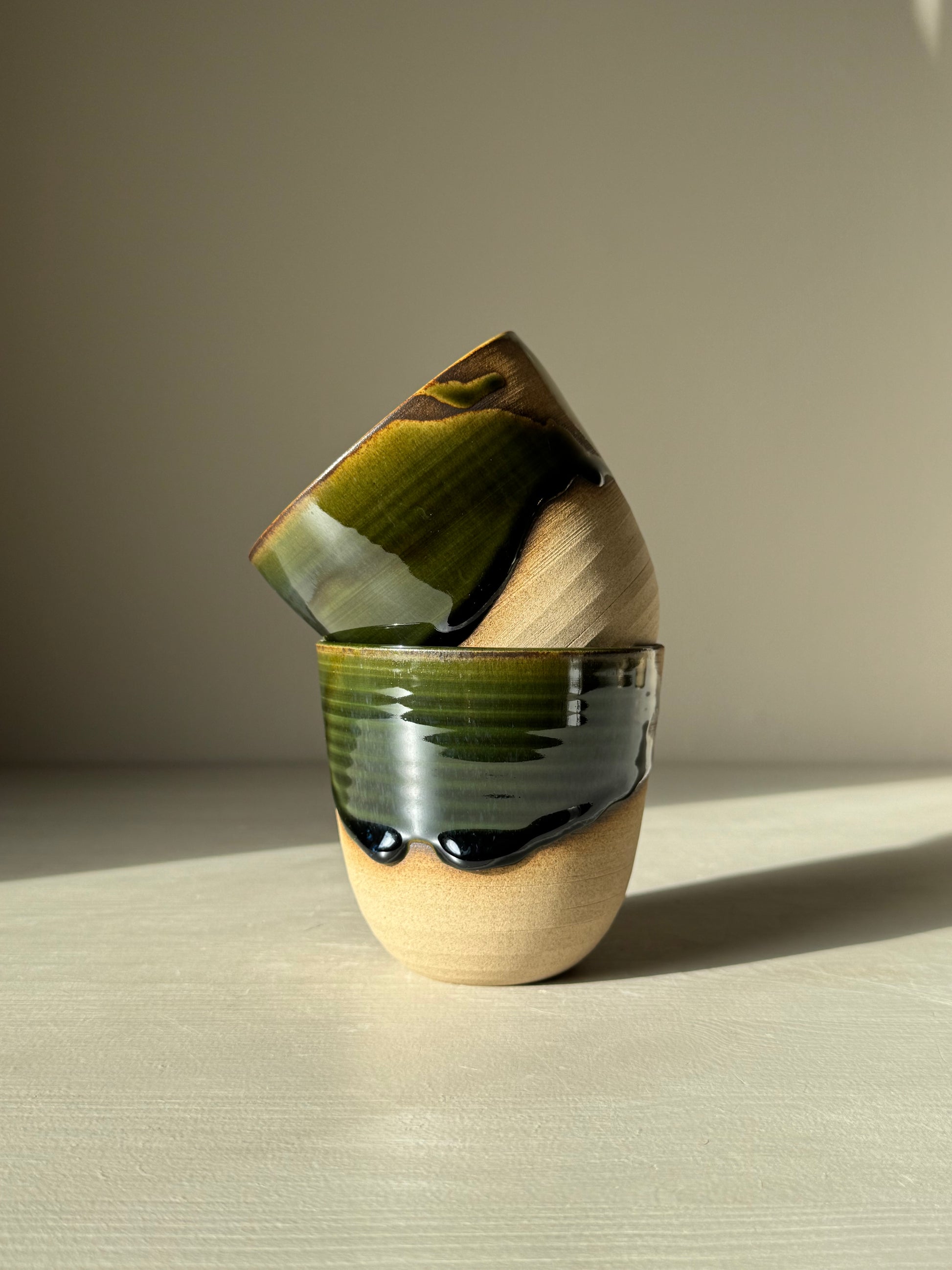 I like how these cups feel honest — simple, but full of quiet character. The half-dipped glaze brings together contrast and harmony — glossy green meeting clear, revealing the natural warmth of the clay beneath.