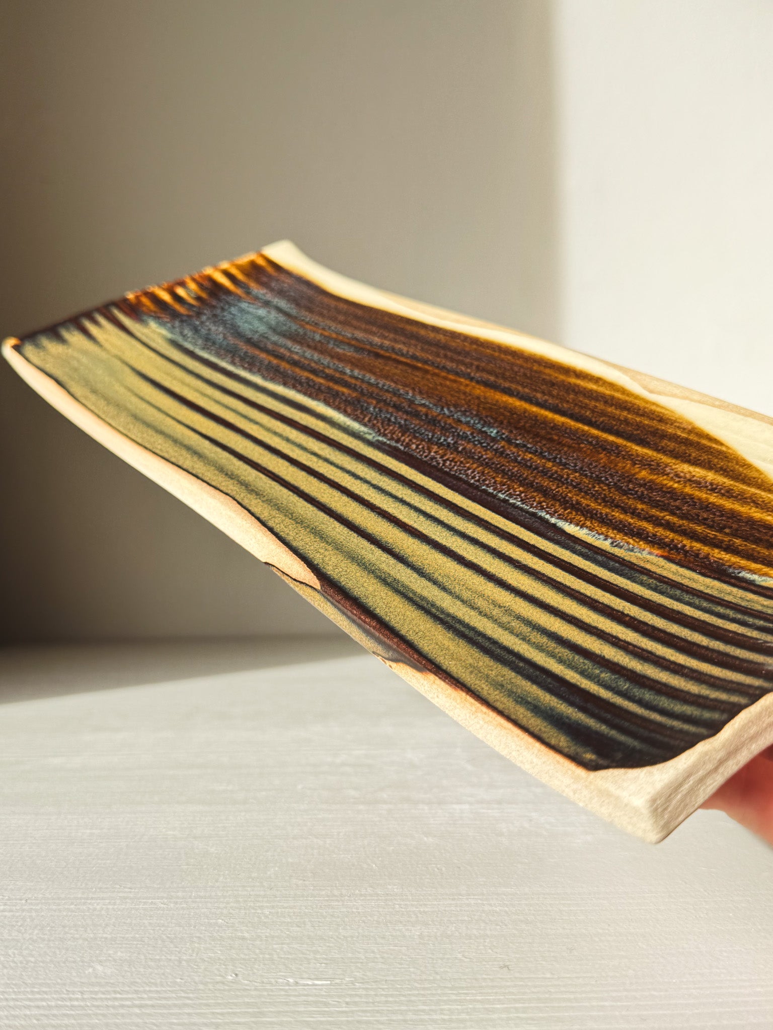 This plate is full of presence. The rectangle shape feels modern, while the warm clay and flowing glazes add something earthy and quiet. The clean lines and gentle glaze variations make this plate perfect for sushi, small bites, or a simple breakfast spread. It sits beautifully on a table and works just as well as a display piece. The natural tones pair easily with other Inyo pieces or stand gracefully on their own.