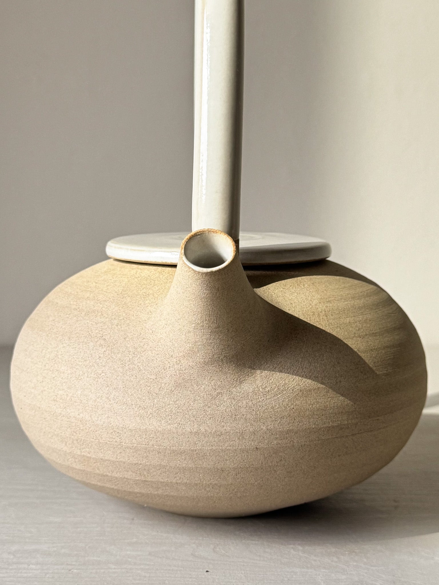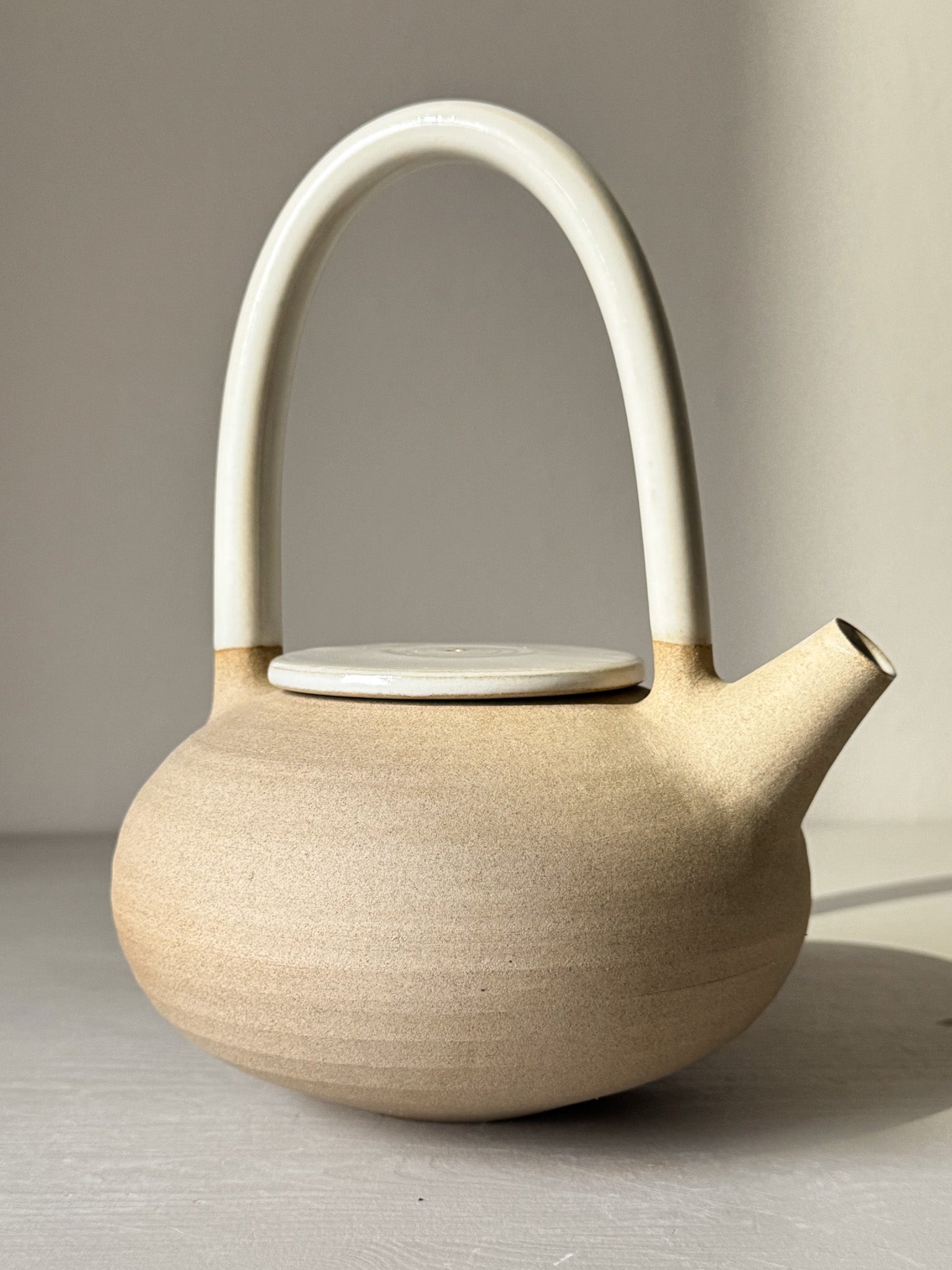 This teapot has a serene presence — steady on the table and lovely to hold. The tall handle is elegant yet practical, giving a comfortable and easy pour. The white glaze settles in its own natural way on every curve, making each piece a little different from the next, while the raw clay below adds warmth and texture.
