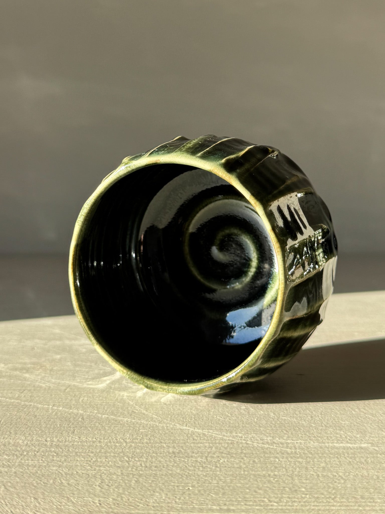Each cup is made by hand and decorated with slip, applied in soft, flowing lines that build subtle texture across the surface. The deep green glaze settles into these lines, creating variation and depth. No two cups are alike — and that’s exactly what makes them special.