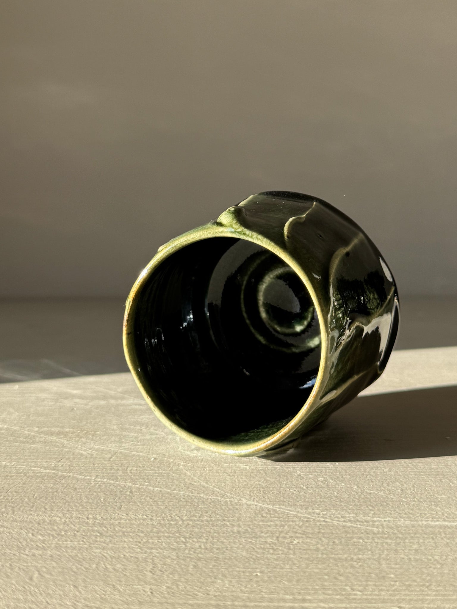 Each cup is made by hand and decorated with slip, applied in soft, flowing lines that build subtle texture across the surface. The deep green glaze settles into these lines, creating variation and depth. No two cups are alike — and that’s exactly what makes them special.