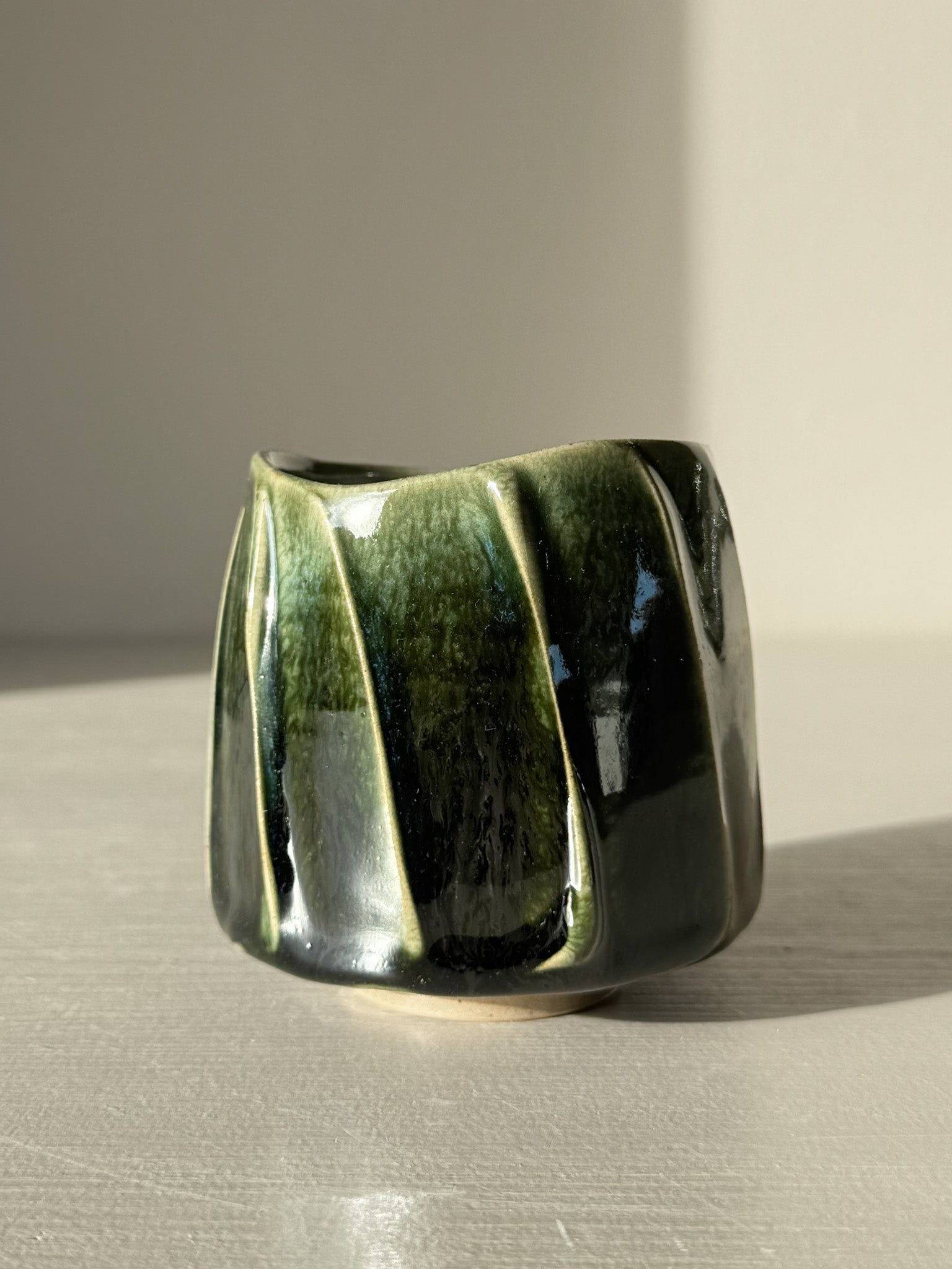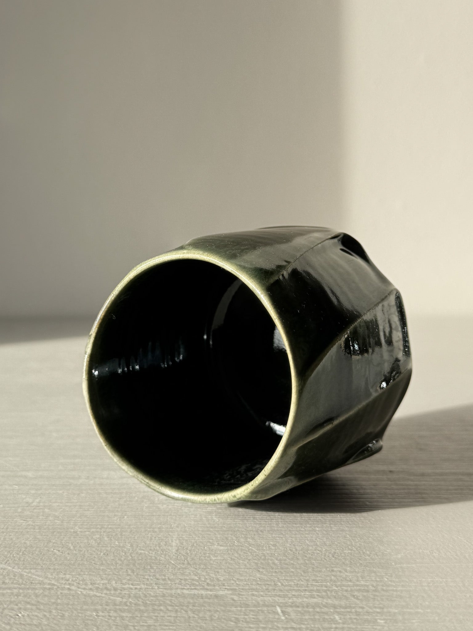 Each cup is made by hand and decorated with slip, applied in soft, flowing lines that build subtle texture across the surface. The deep green glaze settles into these lines, creating variation and depth. No two cups are alike — and that’s exactly what makes them special.